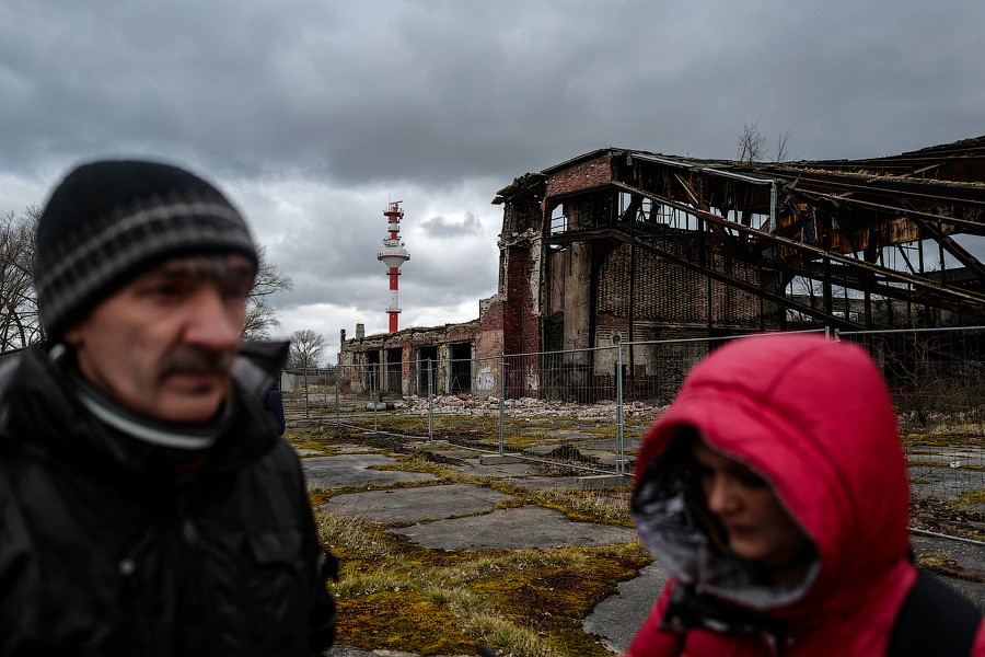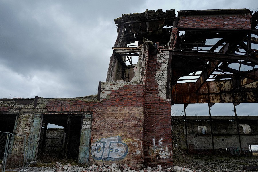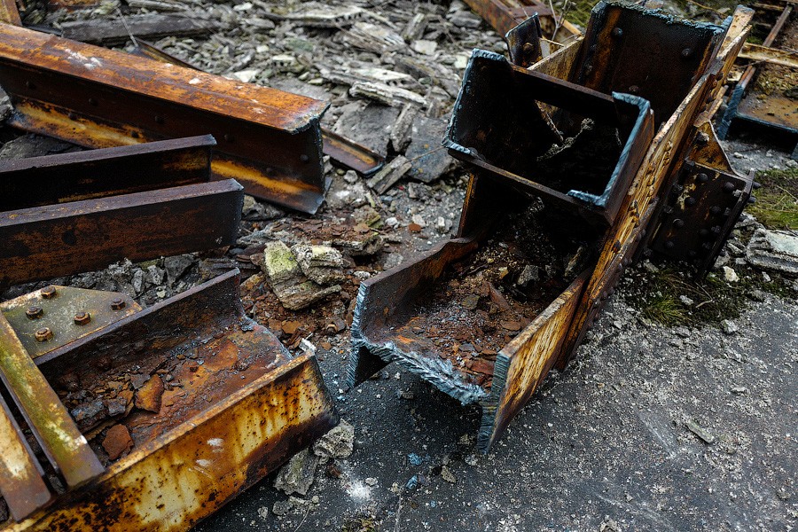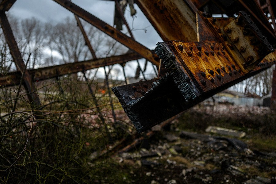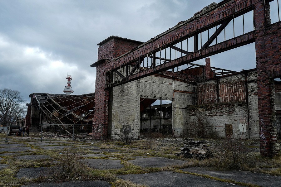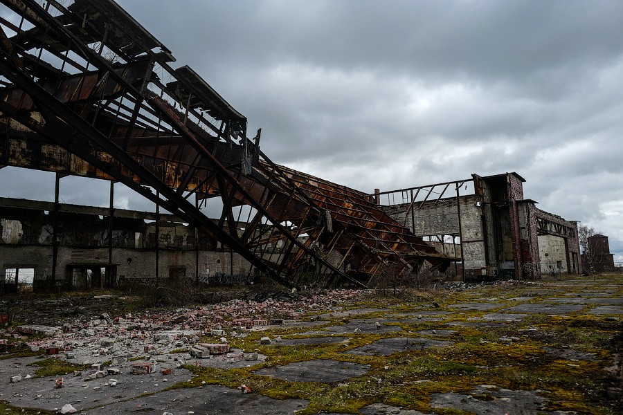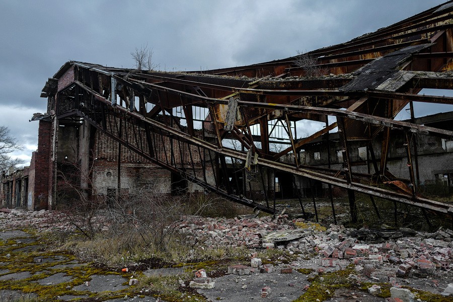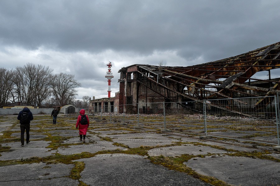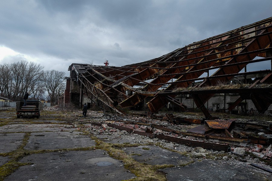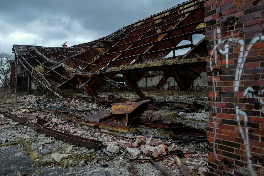Увидеть есть что: грязно-серое небо и само будто вот-вот рухнет на землю, а полуразрушенный ангар под ним напоминает потерпевший крушение космолет. Разбирать начали самый близкий к парому осколок базы «Нойтиф» — он не в лучшей сохранности из пяти. Сейчас часть металлических балок уже срезали, крыша обрушилась, потянув за собой часть стены. Так что вариант «спилят металлические балки и все», озвученный областным правительством, не совсем верен — сноса крыши левая стена ангара не переживет.