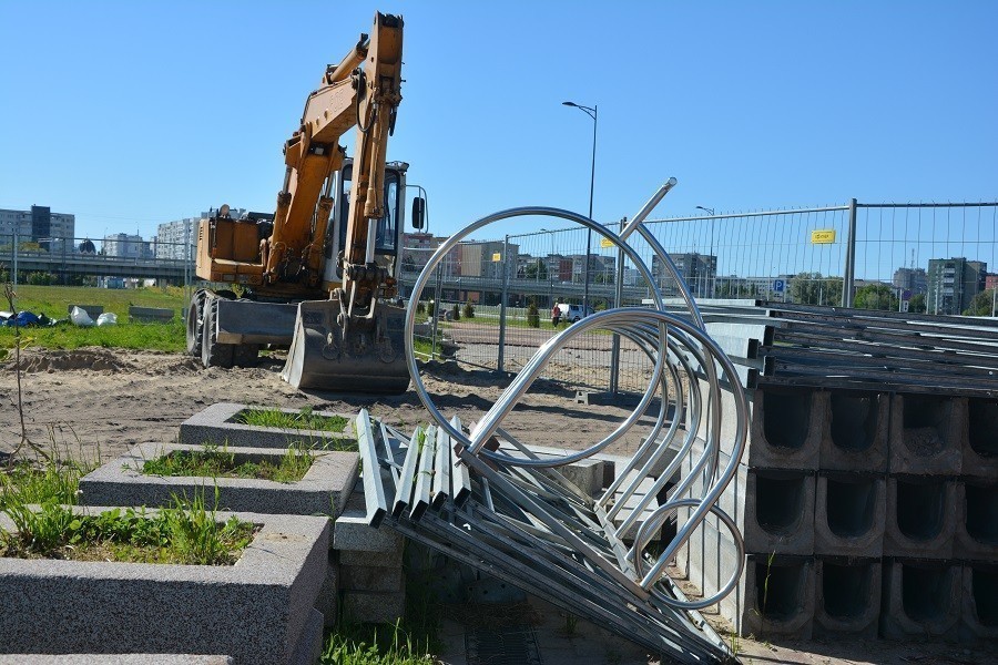 Чтобы подключить будущий комплекс к теплу, вдоль проезжей части между двумя эстакадами прорыли глубокую траншею. Трубы также укладывают на сваи. Из-за высокого уровня грунтовых вод местами используются насосы. Коричневая вода беспрерывно поступает через шланги на автомобильную дорогу и тротуар, откуда уходит в ливневку. Ради теплотрассы также разобрали часть дороги и пешеходной зоны перед одним из входов на территорию стадиона. Тротуарную плитку аккуратно уложили на поддоны, а в поле из кусков асфальта сделали кучу высотой в несколько метров.