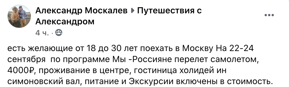 Репост объявления из группы «Путешествия с Александром» в соцсети «Фейсбук*»