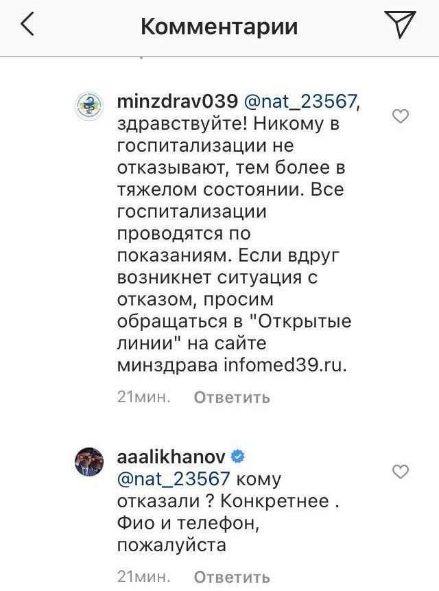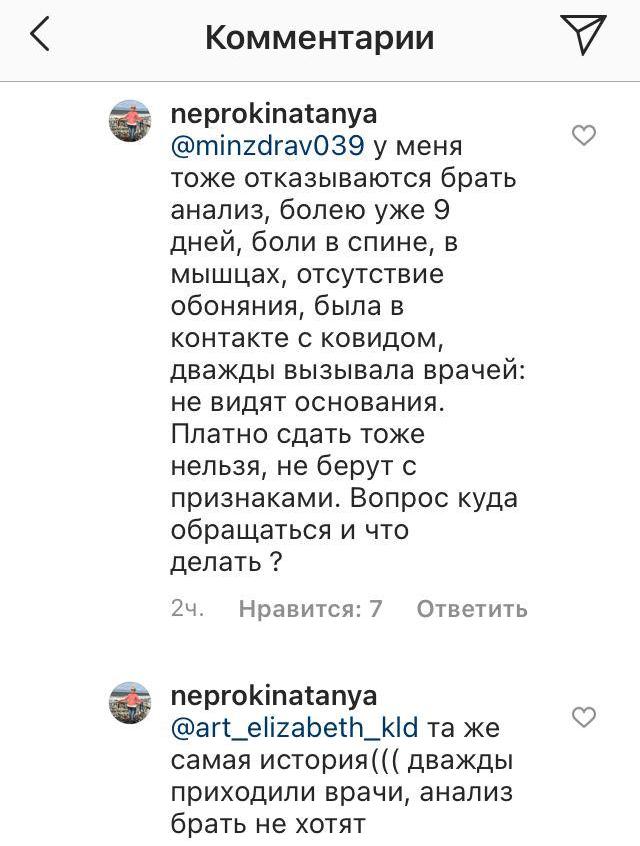 Областной минздрав на вопросы калининградцев в «Инстаграме»* губернатора Антона Алиханова о том, почему не делают тесты при наличии симптомов «ковида», поясняет, что анализы положены не всем. «Тестирование на коронавирус не входит в программу госгарантий и без предписания Роспотребнадзора проводится только при подозрении на пневмонию», — заявляют в ведомстве.