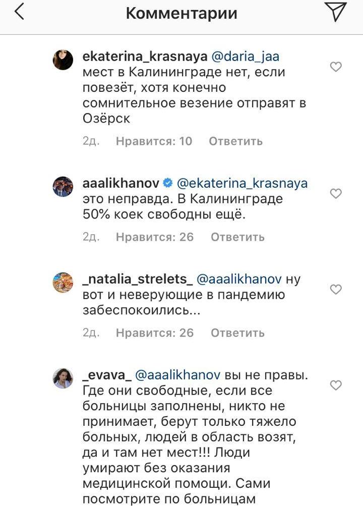 Несмотря на это, власти отрицают проблемы с коечным фондом как для «коронавирусных» пациентов, так и для остальных заболевших. 17 октября губернатор Антон Алиханов заявил в своём инстаграме, что в Калининграде свободно около половины мест в больницах.