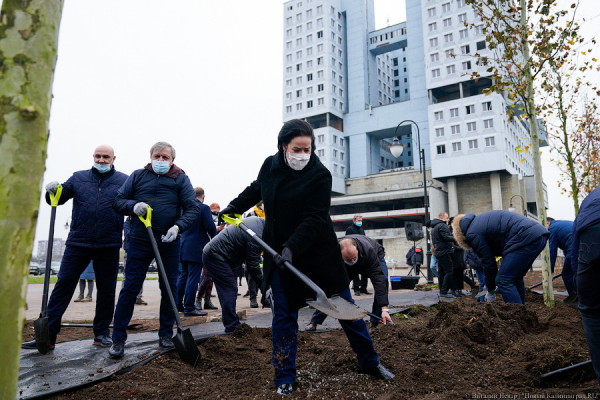 В среду, 11 ноября, чиновники, депутаты и бизнесмены приняли участие в посадке деревьев у Дома Советов. Губернатор Антон Алиханов рассказал, что ранее региональные власти «выступили с инициативой» о необходимости озеленения сквера, а «предприниматели, которые занимаются строительным бизнесом» эту идею поддержали. В итоге между существующими руинами Королевского замка и скоро канущим в лету Домом Советов появилась аллея из 21 платана. Общая стоимость высаженных деревьев, по данным регионального правительства, — порядка 5 млн рублей.