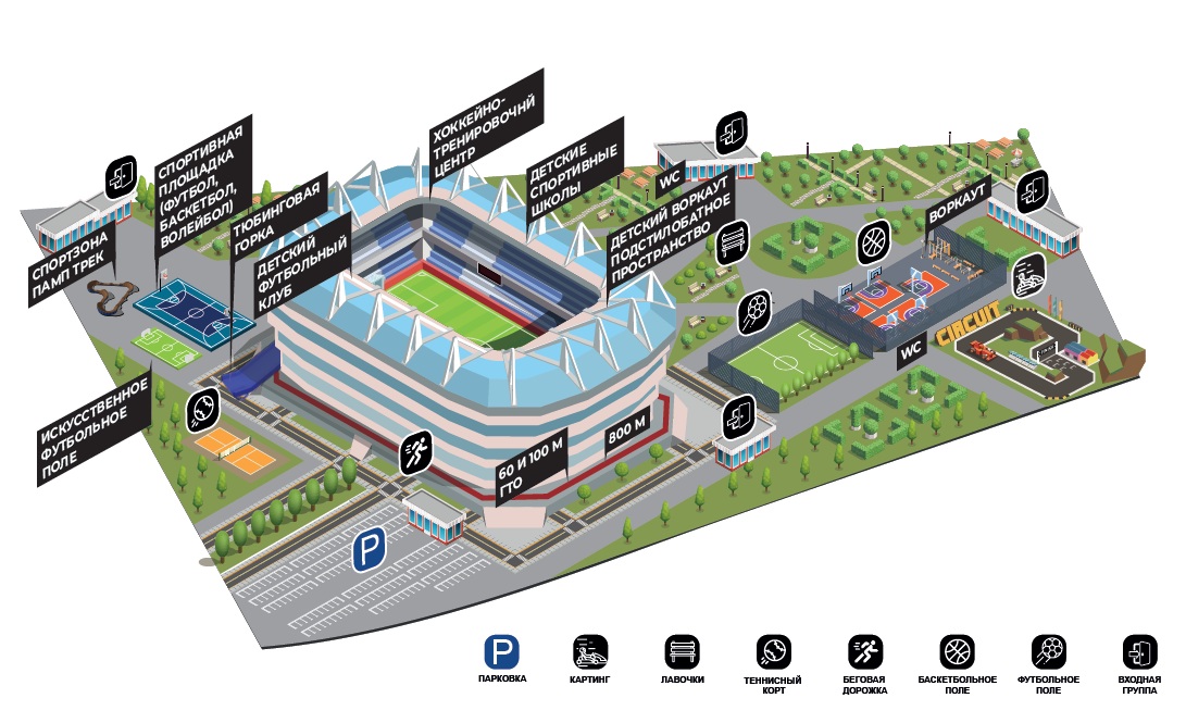 По итогам анкетирования 758 человек выяснилось, что большинство из них одобряет беговую дорожку, волейбольную площадку, площадку для большого тенниса и велотрек. Как пояснили в администрации спортивной арены, с учётом этих данных была разработана концепция развития прилегающей территории. Эскизы и проекты отдельных площадок заказали у профильных организаций.