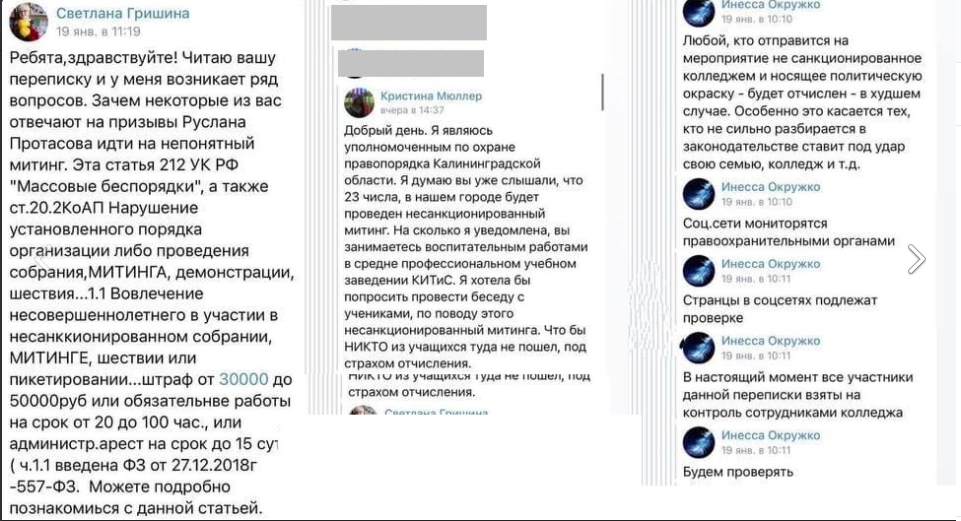 При этом некая Светлана Гришина сообщает студентам КИТиС о том, что за участие в несанкционированном митинге может грозить административное наказание согласно ст. 20.2 КоАП РФ, а также уголовное наказание по ст. 212 УК РФ. В одном из сообщений она сулит учащимся «лишние проблемы и испорченные судьбы», поскольку те рискуют встать «на учет в базу данных ФСБ». В этой же переписке присутствует сообщение от пользователя по имени Кристина Мюллер — этот профиль во «ВКонтакте» закрыт. Девушка представляется «уполномоченным по охране правопорядка Калининградской области» (такой должности официально не существует) и просит ответственного за воспитательную работу в колледже провести беседу со студентами, «чтобы никто туда не пошел под страхом отчисления».