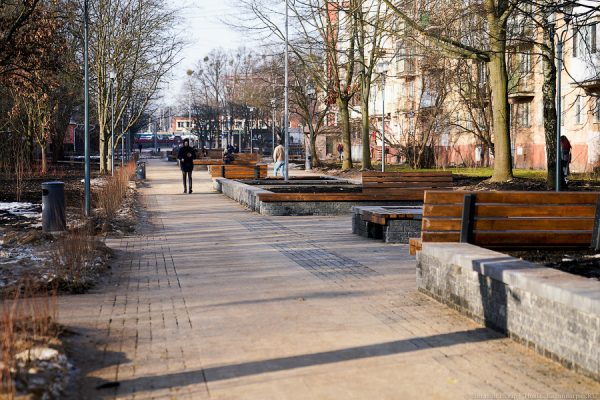 В начале февраля 2021 года с подвергнутой благоустройству пешеходной зоны на ул. Рокоссовского убрали забор и открыли проход для горожан, но увидеть результаты проделанной работы стало возможным только сейчас — когда растаял снег. Фотокорреспондент «Нового Калининграда» не упустил такой шанс.