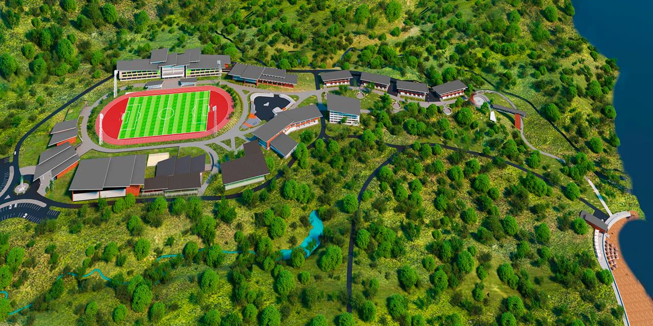 На первом этапе, согласно документации, предусмотрено строительство учебно-образовательного центра, столовой, универсального спортивно-культурного комплекса и пяти жилых корпусов. Наряду с этим запланированы медико-восстановительный блок, крытая площадка для игровых видов спорта, спасательная станция с медпунктом, КПП, лифт для маломобильных категорий населения, стадион и две трибуны, каждая из которых рассчитана на 200 зрителей.