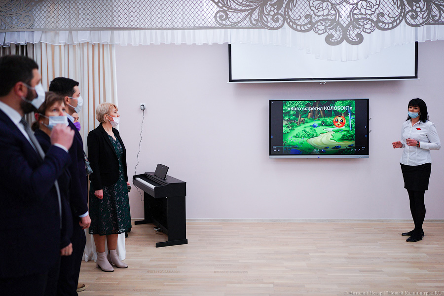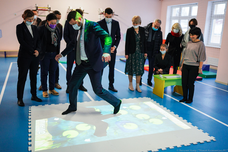 Помимо губернатора осмотрели свежеокрашенные помещения, пощупали мебель и опробовали современное оборудование министр образования региона Светлана Трусенева, сити-менеджер Елена Дятлова, глава города Евгений Любивый. Последний даже лично опробовал интерактивный тренажер, предназначенный для развития внимания, логики и координации. Также чиновникам довелось попробовать свежую выпечку, приготовленную в детсадовском пищеблоке, и послушать поздравление в стихах от Деда Мороза и Снегурочки.