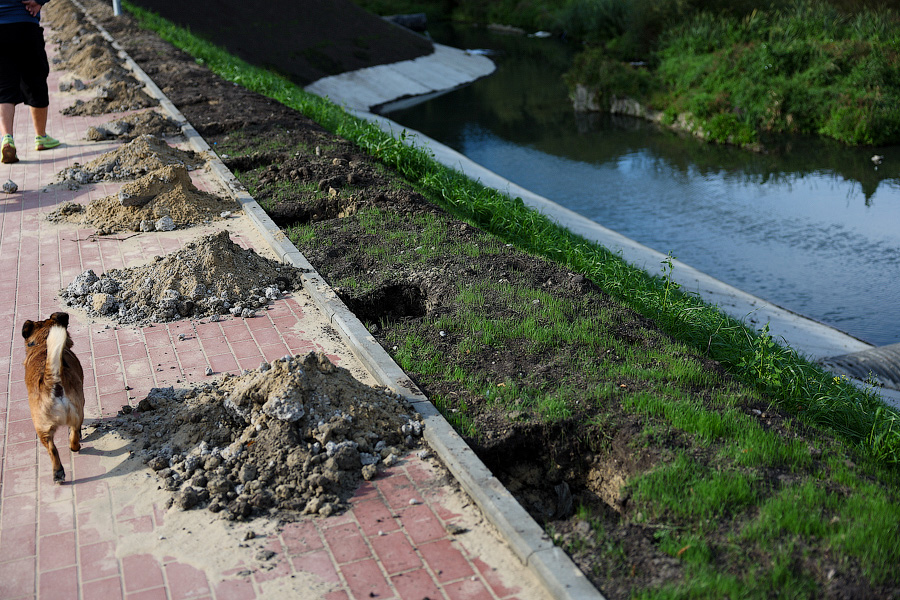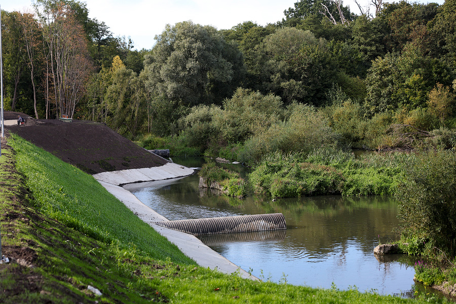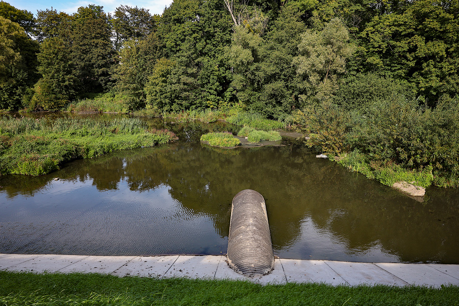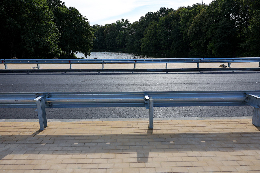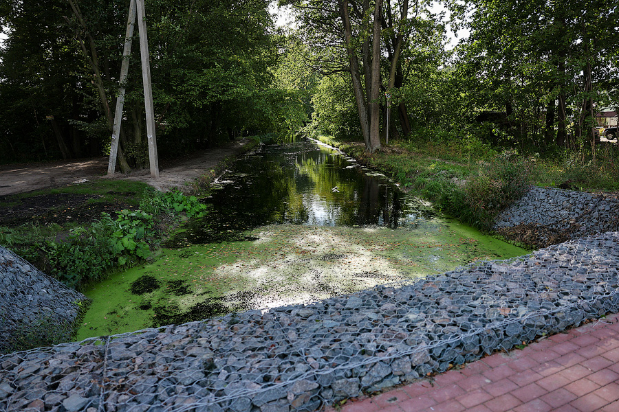 Есть и существенные потери. К ним, например, можно отнести старинную кирпичную арку, под которой ручей Воздушный впадал в озеро Дзержинец. Сейчас арку заменили на полимерную трубу, и это решение сложно назвать удачным с точки зрения ландшафта. Примерно та же картина с пересечением Питьевого канала (довоенное название Ландграбен — прим. «Нового Калининграда»). Здесь под дорогой точно так же уложена пластиковая труба, укрепленная габионами (коробами из металлической сетки, набитыми камнями — прим. «Нового Калининграда»).