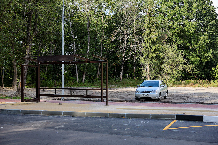 Появились и автобусные остановки. Ранее их можно было опознать лишь по торчащим из земли дорожным знакам. Монтаж еще не закончен (нет стеклянных стенок и навесов), но у подрядчика есть пара недель, чтобы довести все до ума.