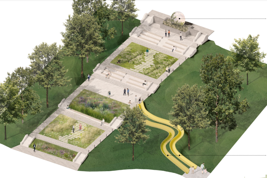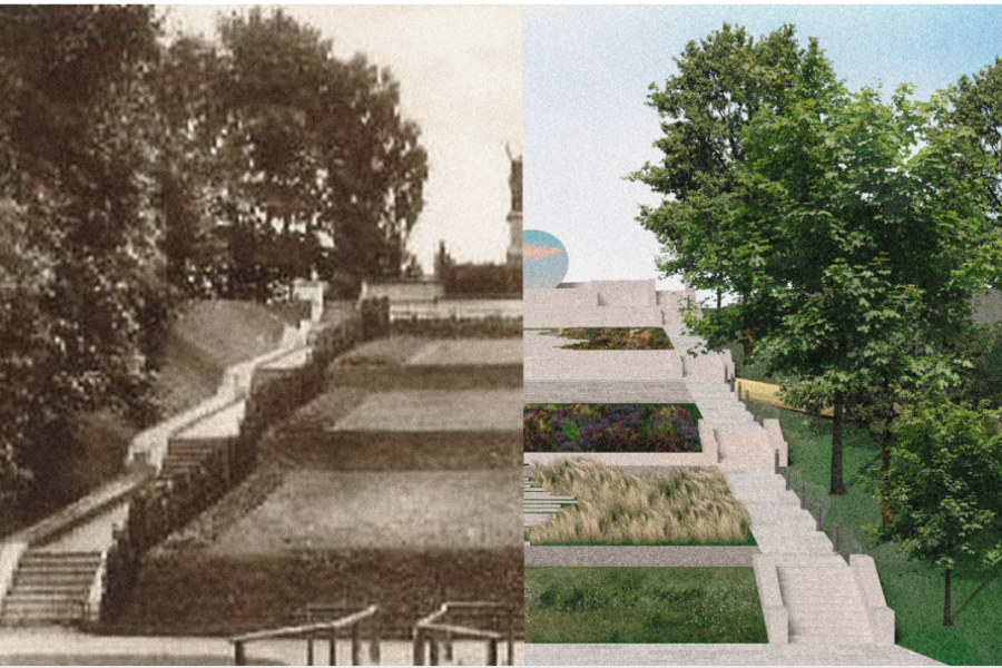 «Вдоль прудов были вытоптаны дорожки, ширина их была небольшая — для одного человека, — продолжает она. — Там выгуливались собаки, кто-то использовал тропинки как транзит, чтобы добраться до работы. Как зоны отдыха их практически никто не использовал. Но в советское время там были карусели. Их спилили. Сейчас там ничего, пустырь. Однако уцелело наследие архитектора Хуго Кауфмана — лестница. Одна ее сторона сейчас демонтирована из-за работ по реконструкции. Естественно, мы ее будем восстанавливать. Она станет центральным объектом „Долины цветов“. Высадим там многолетние растения, сделаем террасирование. С верхней точки откроется обзорный вид. Вся конструкция лестницы будет сохранена. Но вместо памятника наверху будет другой объект. Концептуалы нам предлагают разместить круглое зеркало. Вся современная идея этого пространства — это прозрачность и отражение, а не загромождение пространства какими-то коробками».
