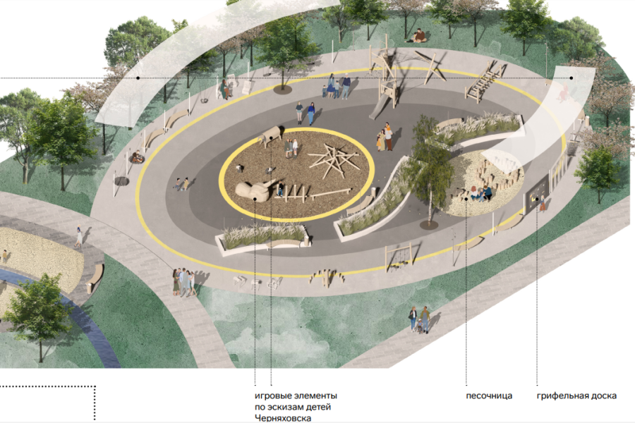 «Наш проект предусматривает другие места под скульптуры. Например, на одной из площадок поставим коня из полированного металла, так как Инстербург был столицей коневодов. Все же знают про тракененскую породу. Изображение его показать не могу, могу только сказать, что конь будет на дыбах стоять, — говорит Лагуткина. — Также отдельно архитекторы занимались проработкой деталей детской площадки. Она появится там, где раньше находились карусели. Ее уникальность в том, что ее нарисовали дети. Мы не брали типовые элементы из каталогов, а провели конкурс среди воспитанников художественной школы (ее начальных классов) и в детских садах. Дети сами рисовали детские площадки, на которых они хотят играть. Из элементов, нарисованных детьми, концептуалы создали визуализацию. А мы обратились на заводы, чтобы нам все это изготовили. Пространство, которое мы спроектировали, — это первая уникальная детская площадка в городе».