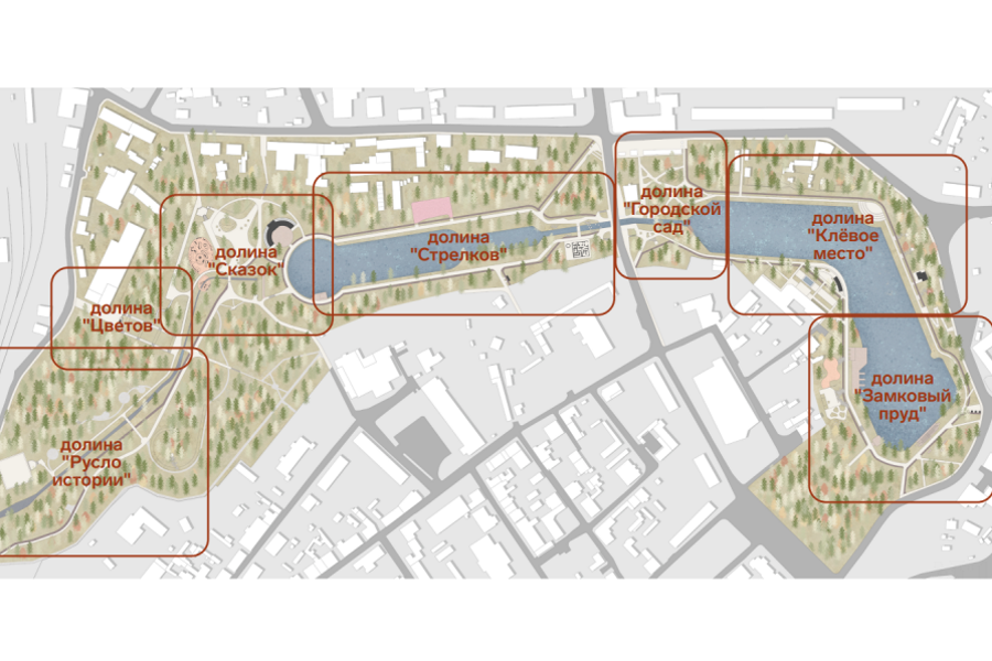 «Концептуально весь проект благоустройства мы назвали „Городской долиной“, потому что исторически это была Долина стрелков, а в советское время тут был городской парк. Мы соединили два названия и получили „Городскую долину“», — поясняет архитектор. — На том месте, где сейчас наши озера, в древние времена, судя по всему, было устье реки Чернуппе. Функционально мы всю эту низину с озерами разделили на семь долин: «Русло истории», «Долину цветов», «Долину Сказок», «Долину стрелков», «Городской сад», «Клевое место» и «Замковый пруд».
