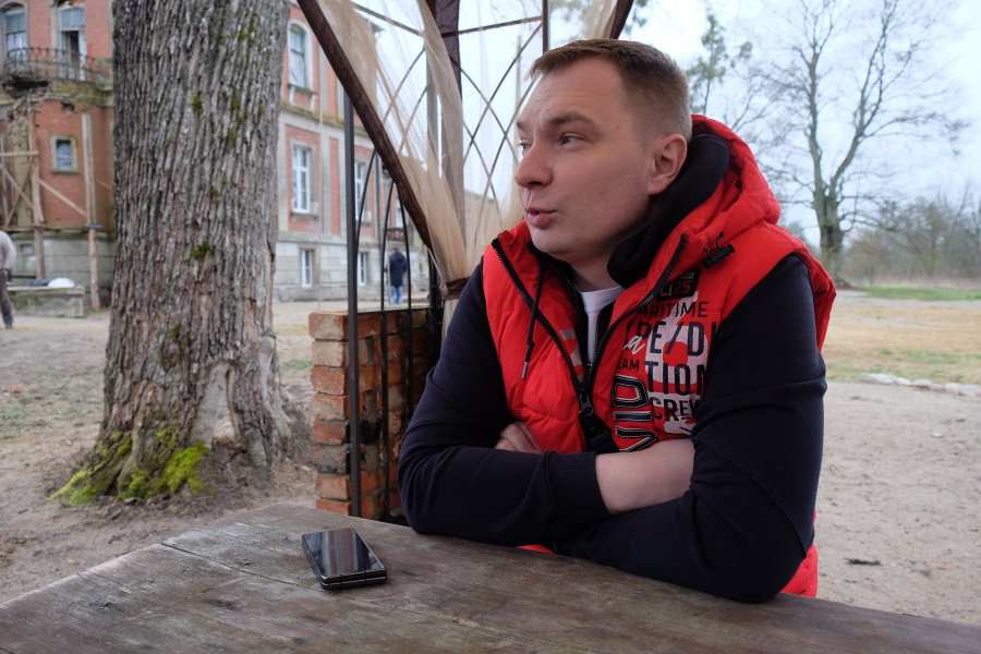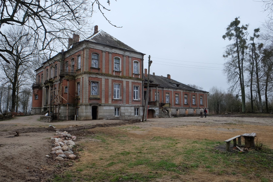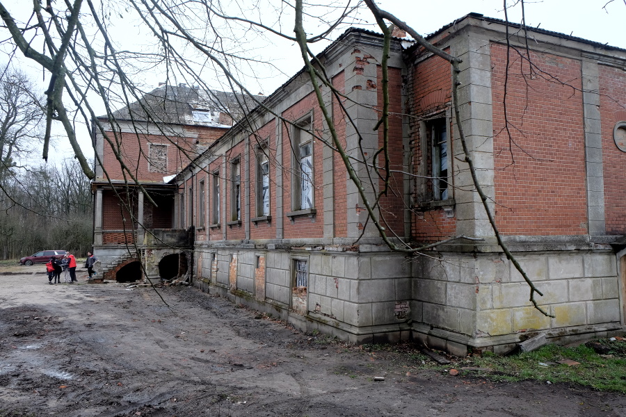 — Узнал о ней году, наверное, в 2018-м. Поехал тогда смотреть усадьбу в Лужках (усадьба фон Заукенов в поселке Лужки Озерского района — прим. «Нового Калининграда»). Мне ее архитектор Олег Ли показал по принципу «может, возьмемся и сделаем». Я посмотрел на дом в Лужках и подумал: «Маловат он будет». Да и расположение у него не очень удобное, прямо по территории проходит дорога, дома сельские там же стоят. Местность тоже так себе. Погода была тогда хуже, чем сейчас, тоже март, но более пасмурно. Из Лужков мы ехали в сторону Знаменска, и Олег сказал: «Давай еще кое-что тебе покажу». Мы завернули в Чайковское. Дорога тут была ужас, темно, серо, мы идем по этой грязи непролазной, по месиву. Подходим — ничего не видно, а потом открывается эта махина. Выглядело все слишком страшно: дверей нет, темные проемы окон, из которых кусты растут. Я даже внутрь не заходил, мы уехали сразу.