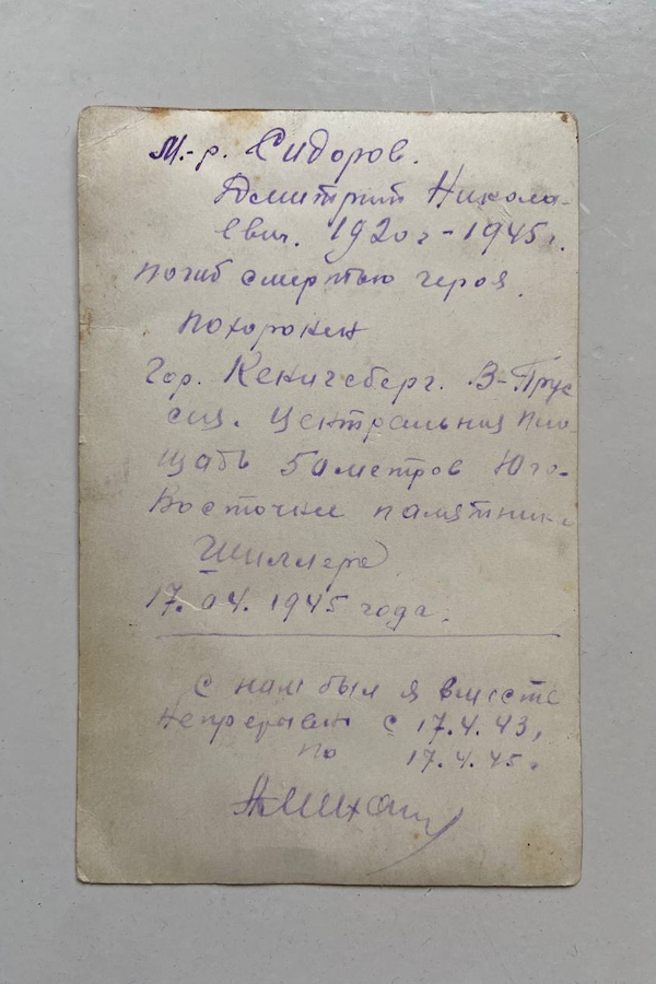 Весной 2018 года калининградский краевед Александр Панфилов приобрел на одном из интернет-аукционов фото майора Красной армии Дмитрия Сидорова. Его заинтересовала подпись на обороте, в которой сообщалось, что офицер погиб под Кёнигсбергом и похоронен в центре города у памятника Шиллеру. Вскоре у Александра возникла мысль найти родственников Сидорова и вернуть им фото, но эта история затянулась еще на пять лет и завершилась лишь в мае 2023 года. «Новый Калининград» пообщался с родственниками погибшего героя и узнал, что пропало не только фото майора, но и более ценные вещи.