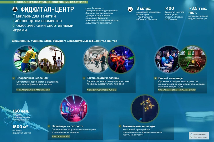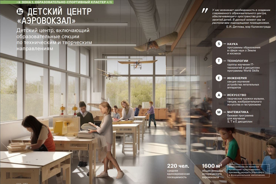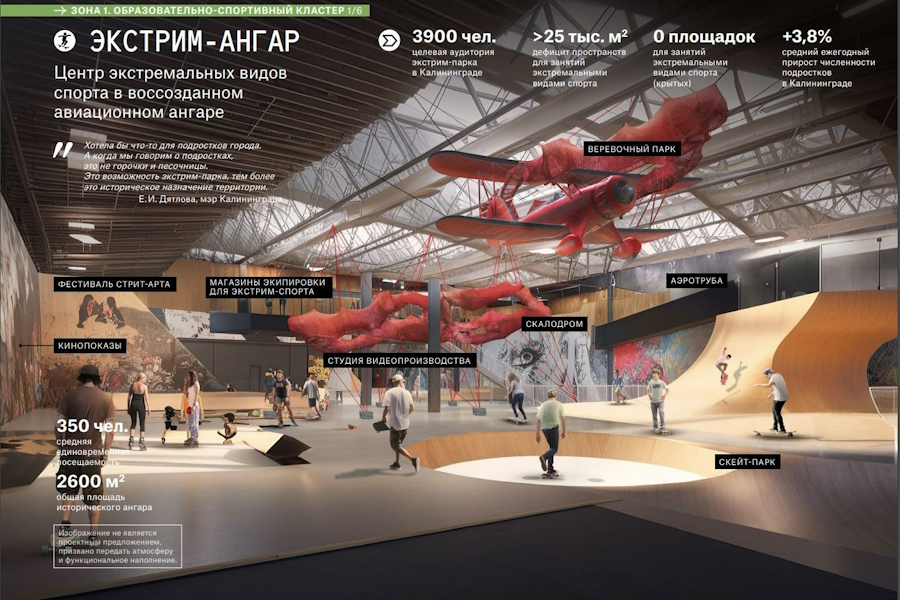 Образовательно-спортивный кластер займёт западную часть Девау у входа с Пригородной, где сохранились исторические постройки. Предлагается восстановить три авиационных ангара, аэровокзал и реконструировать диспетчерскую. В ангарах хотят открыть экстрим-парк, фиджитал-центр и интерактивный инженерный музей с игровой академией авиапрофессий. В здании аэровокзала должен появиться «современный аналог Дома пионеров» с образовательными секциями. Также предусмотрен павильон для «фудмаркета и коворкинга», где предлагают продавать марципановые самолётики и клопсы на шпажке. В этой же зоне расположен «детский авиапарк» — открытая тематическая игровая площадка.