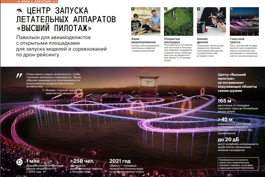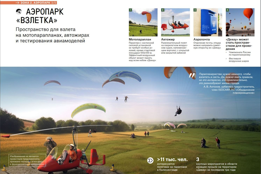 Взлётно-посадочная полоса должна стать центральной аллеей с аэропарком «Взлётка» в конце, где выделили место для мотопарапланов, автожиров и тестирования авиамоделей. Также здесь предлагается оборудовать гоночную трассу для дронов и тематическую площадку для пейнтбола.