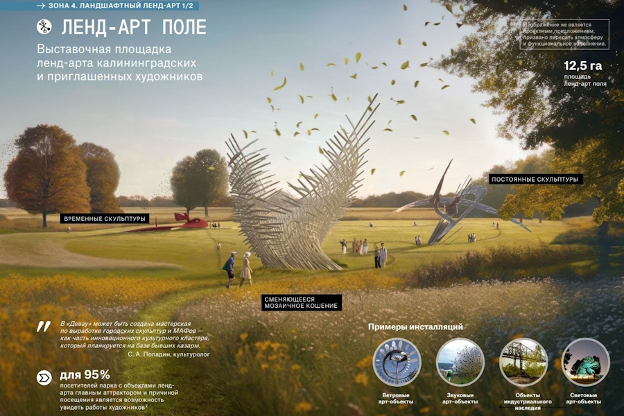 Зона ландшафтного ленд-арта занимает 12,5 гектаров. Там хотят сделать выставочное поле для калининградских и приглашенных художников, где можно расположить временные или постоянные объекты. Кроме того, здесь выделено место под ещё одну площадку для выгула собак и зону для пикников с беседками.