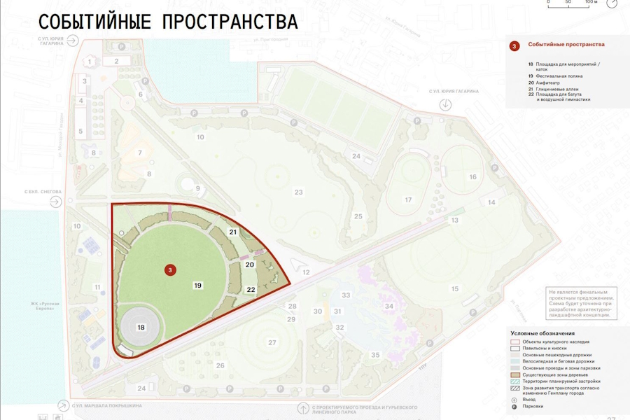 «Есть ещё один сценарий парковочный — это дни мероприятий и фестивалей. В среднем это порядка 10-12 тысяч человек. И на такое количество людей, конечно, нужно гораздо больше парковок, порядка 4800, а это уже 12 гектаров и 10% парка. Коллеги из города сказали, что данные парковки могут быть расположены в зоне планируемого развития транспорта, там же располагается будущий транспортно-пересадочный узел», — сообщила руководитель проекта.