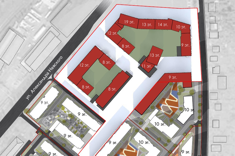Жилой массив в северной части участка у путепровода на Невского застройщик пытается согласовать более двух лет. Первый раз проект на градостроительный совет вынесли в апреле 2021 года, тогда речь шла о шести 17-этажных домах. Члены совета отклонили проект и предложили представить видение застройки всей территории площадью 14 га, а не части, а также объяснить, как в микрорайоне на несколько тысяч жителей будет развиваться социальная и транспортная инфраструктура.