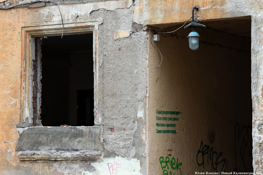 Его кафе резко контрастирует с тем, что творится вокруг. Здание уже покрыто граффити, стекла выбиты, повсюду — осколки и окурки. Окна заколочены досками, сквозь щели видны старые обои с цветами, кафель на маленьких кухнях. Жизнь отсюда ушла совсем недавно, но безвозвратно. В арке на стене — стихи: