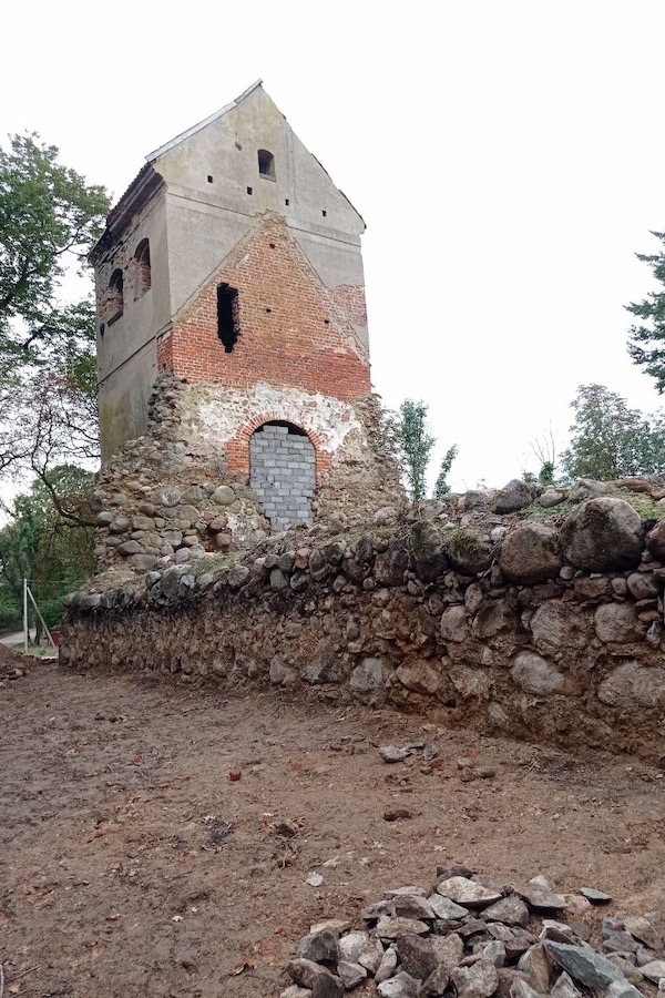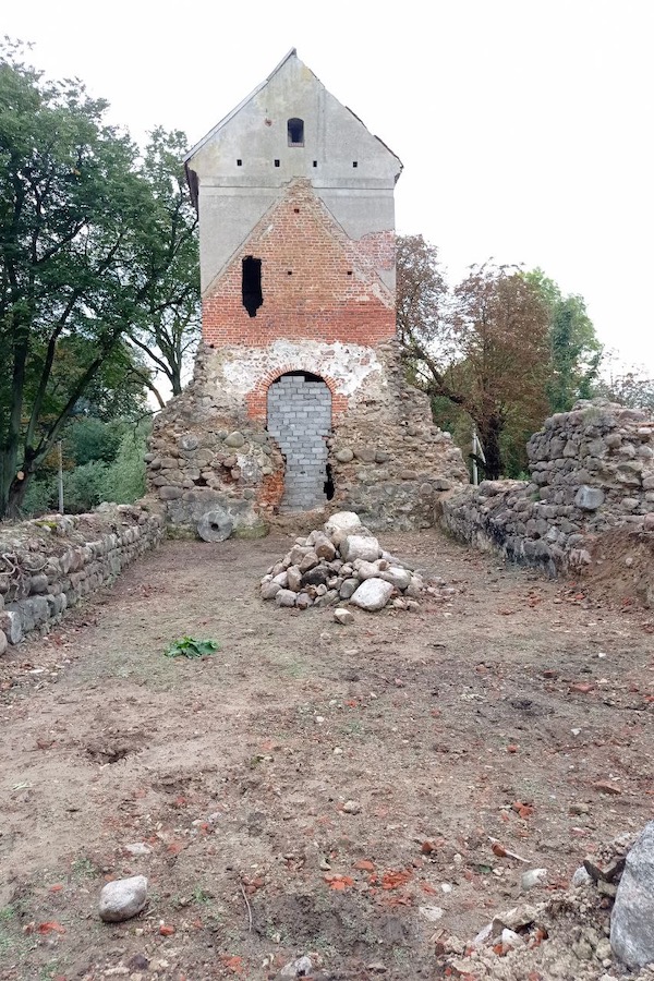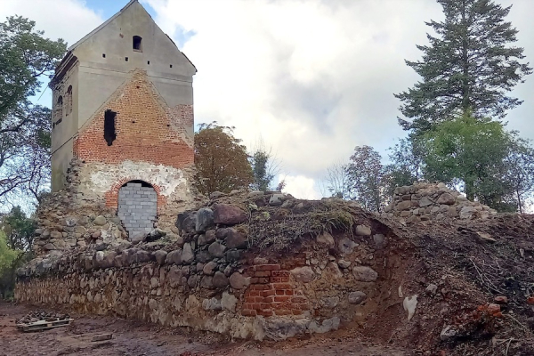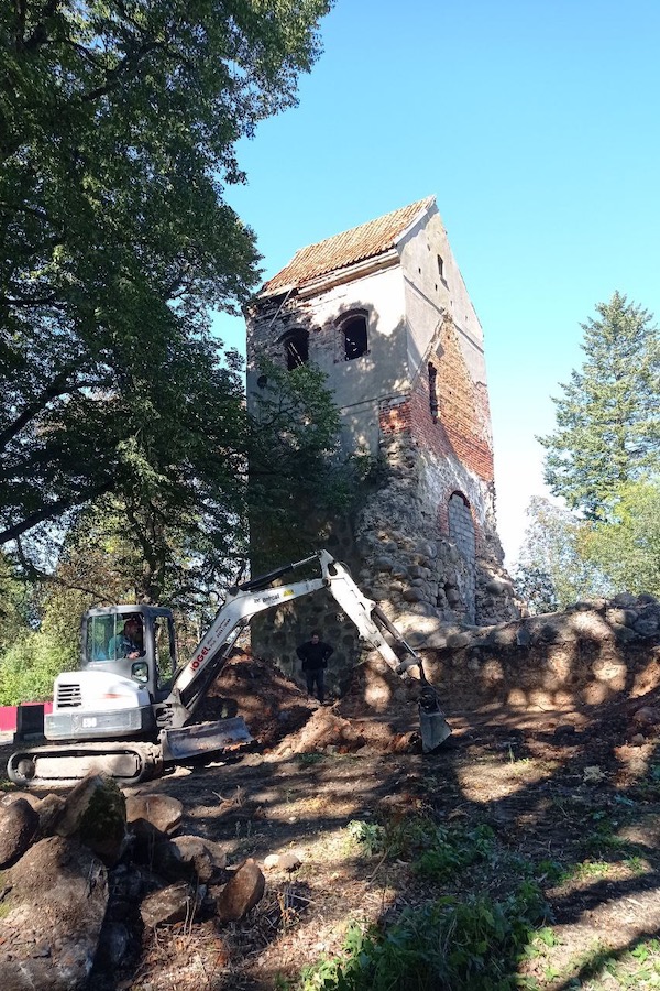 Мария пояснила, что разрешительное письмо от епархии она получила 22 августа, и уже к 23 сентября вокруг кирхи было расчищено две трети территории. Кроме того, были укреплен угол храма, часть бутовой кладки и восстановлен дверной проем.