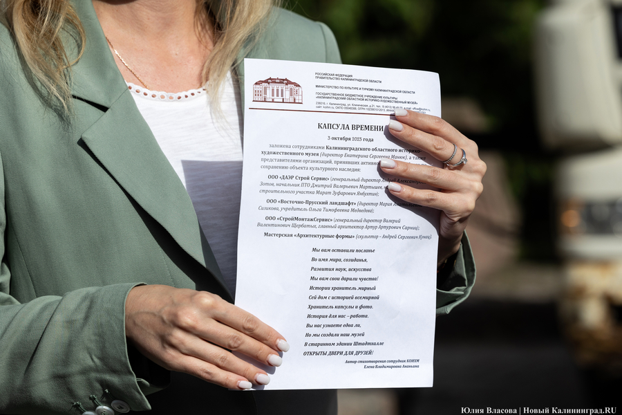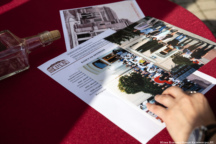 Внутрь барельефа заложили «капсулу времени» с перечислением всех причастных к сохранению памятника архитектуры, а также стихами. «Мы вам оставили посланье во имя мира, созиданья...», — так начинается поэтический текст, который напечатан на листке и засунут в бутылку.