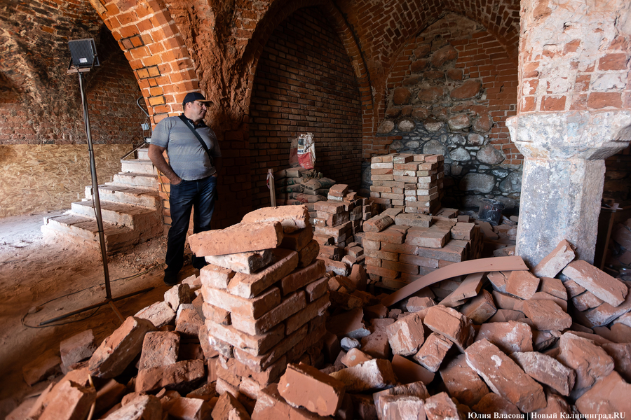 «В 1945 году замок вообще не пострадал либо пострадал минимально, — указывая на следы пожара, поясняет Альберт Адылов. — Но вот в 1914 году у здания сгорела вся верхняя часть, это была церковь, надстроенная в 70-х годах XIX века. Есть архивные фото и с целой крышей, и с разрушенной. Крышу в приблизительно первоначальном виде еще сами немцы после Первой мировой восстановили».