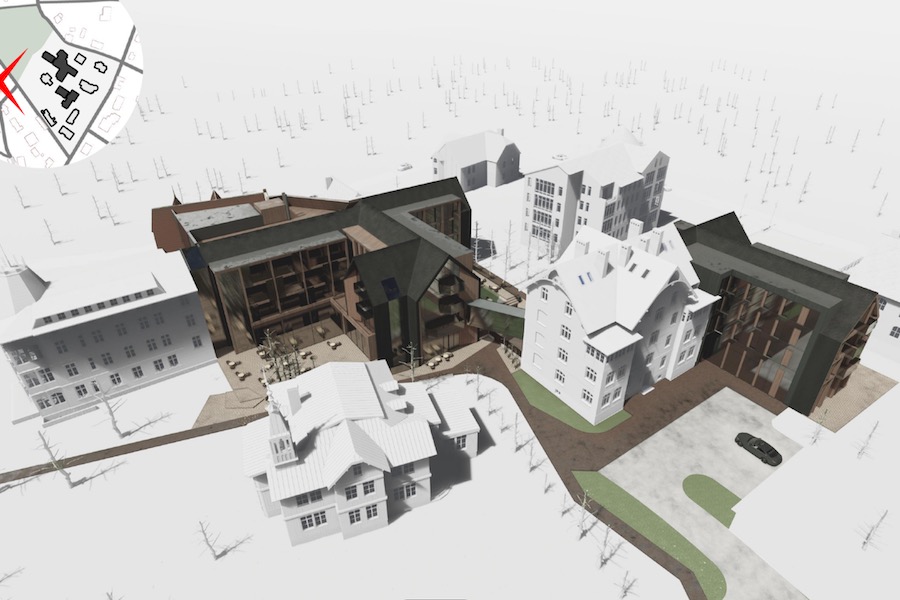 Рядом с довоенным пансионатом «Лесной замок» инвестор намерен построить здание в «светлогорском стиле», за которым будет «спрятано» главное и самое большое стеклянное здание, которое Башин назвал четырехуровневый атриумом.