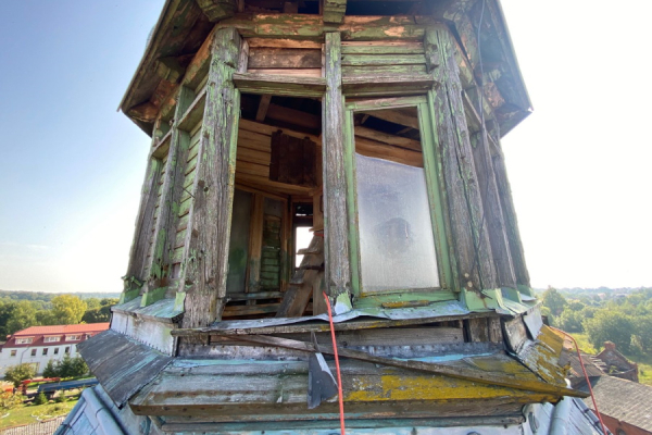 По его словам, основные проблемы у этого объекта с кровельными материалами на башне и, собственно, с самим конструктивом башни — деревянные конструкции успели прогнить, и рассчитывать, что они, как и раньше, могут выдерживать серьезную нагрузку, не приходится.