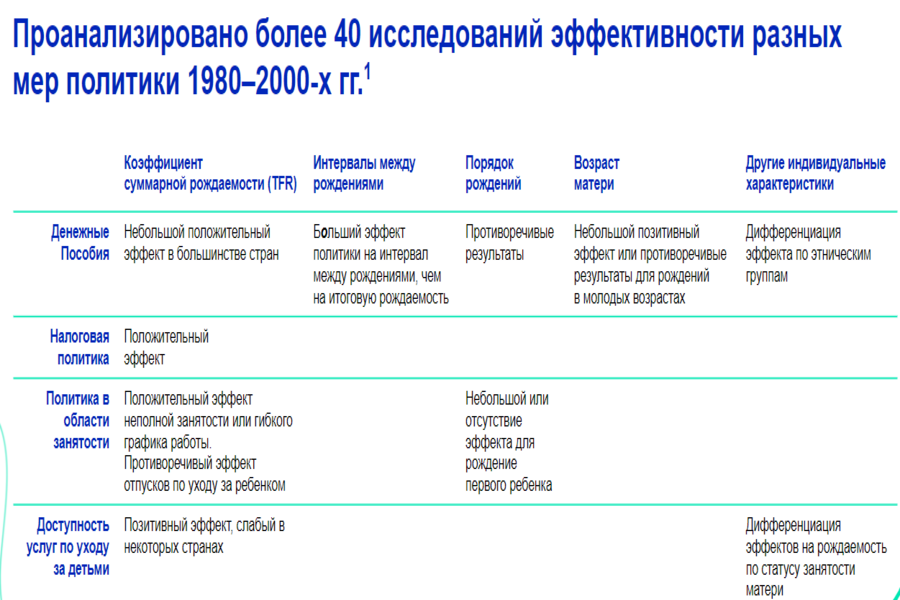 По результатам исследований эффективности разных мер политики 1980-2000-х, положительный эффект отмечается при выплате государством денежных пособий, проведений налоговой политики и политики в области занятости, а также доступности услуг по уходу за детьми. В России развиваются все виды мер поддержки.