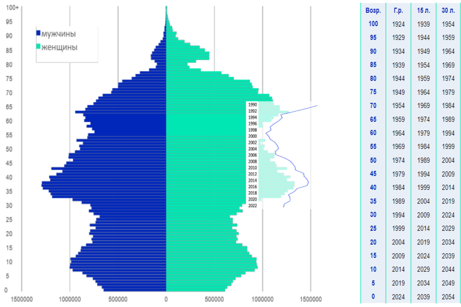 Смотря на половозрастную пирамиду, можно спрогнозировать будущее. Десять лет назад росла рождаемость, сейчас же она пошла на спад. «Во-первых, это следствие того, что идет малочисленная когорта. Во-вторых, это следствие того, что у населения начинают меняться установки на деторождение, на браки, на партнёрство. Это обновление практик и установок ведёт к тому, что деторождение откладывается», — назвала причины снижения рождаемости Митрофанова. По её словам, если раньше дистанция между детьми и родителями составляла 30 лет, то сейчас эксперты ожидают, что она увеличится. «Поэтому, если мы в период, когда выходит в репродуктивный возраст многочисленная когорта, ещё насыпаем какие-то „плюшки“ государства, то это значит, что мы сдвигаем календари рождения, и вся та масса детей, которая могла родиться в течение 10−15 лет, рождается в один конкретный комочек времени». Подобная ситуация наблюдалась в 2010−2015 годах, следом за ней пошла «малочисленная когорта», у которой «отложилось» рождение.