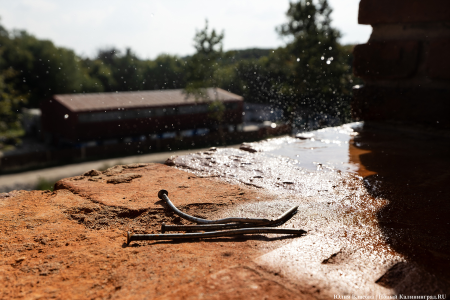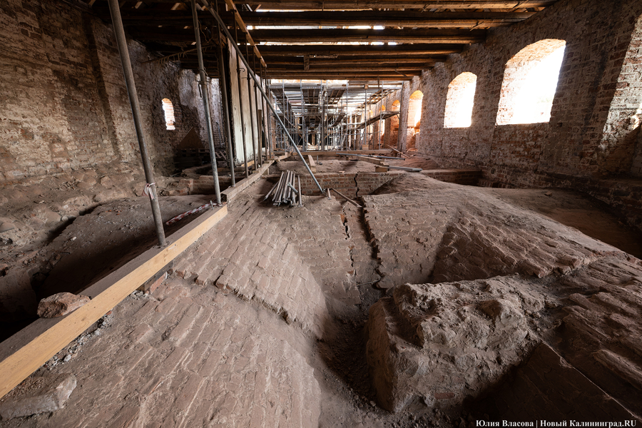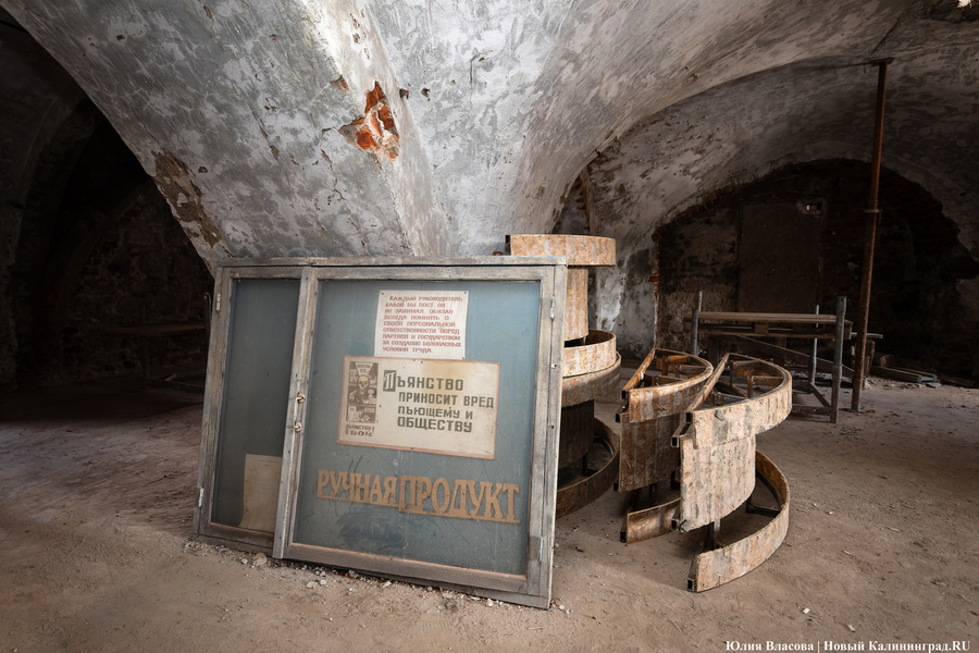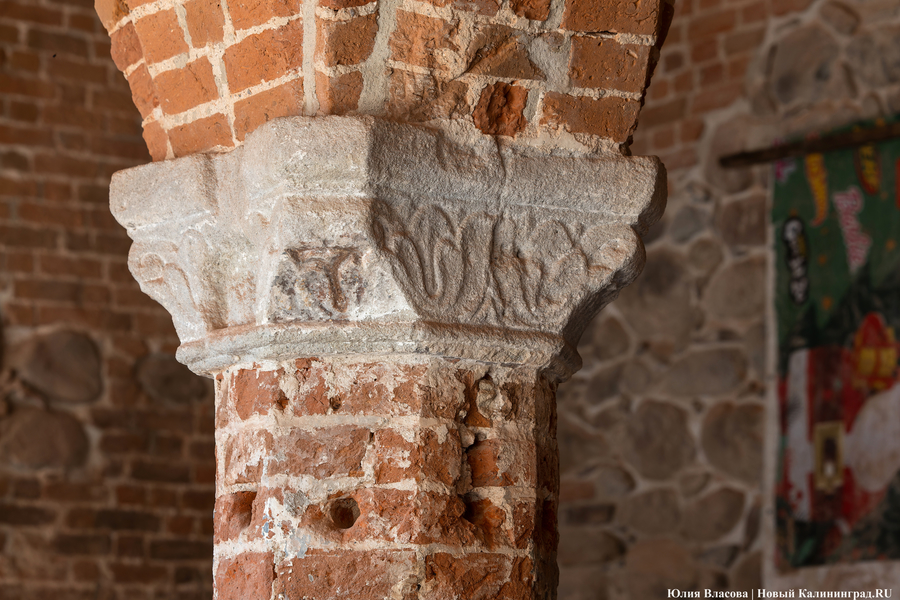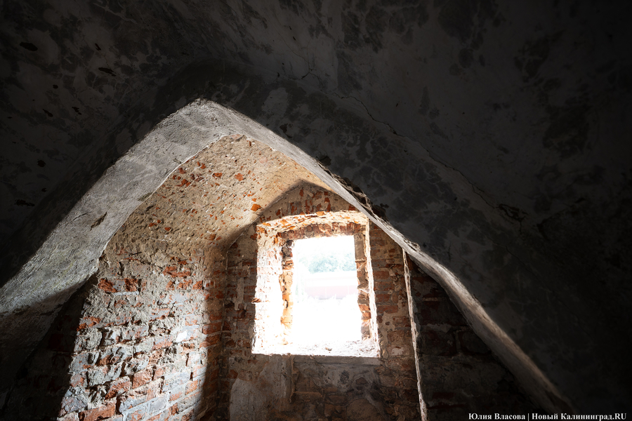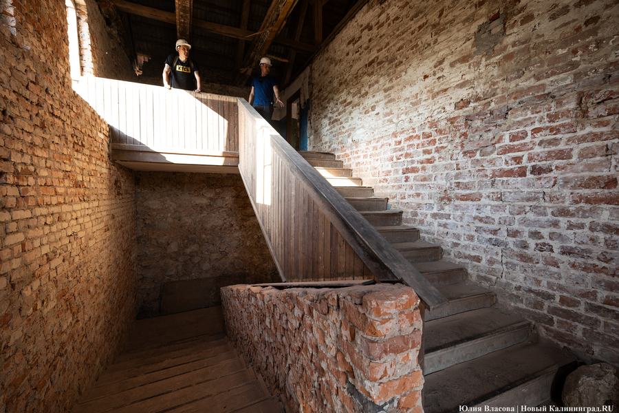 «Весь третий этаж был ликвидирован во время боевых действий конца Великой Отечественной войны, — поясняет Игорь Маревичев. — Наши войска как раз наступали со стороны кирхи. С южной стороны у нас лес, где находилась позиция СС и танковые подразделения. С северной стороны — аэродром Нойхаузен со своей охраной. Сама кирха пострадала ещё при первом заходе Красной армии в город, там на башне следы остались — миномётный снаряд туда попал, который пробил только первый слой кирпича, а стропильная система внутри вообще не пострадала. Далее в районе замка (это ведь транспортная развязка) начались очень кровопролитное сражение, и цитадель четыре раза переходила из рук в руки. Павших солдат в подвальных помещениях складировали. Интересно, что главная круглая башня пострадала не сильно — вся металлическая конструкция рам осталась оригинальной».