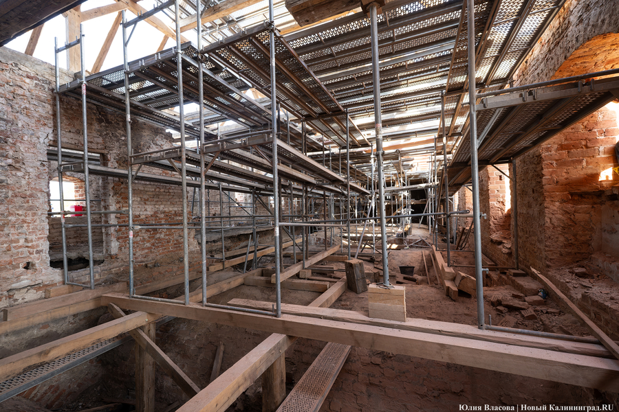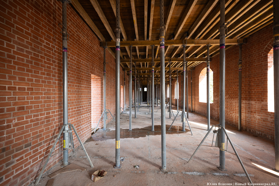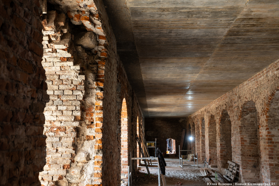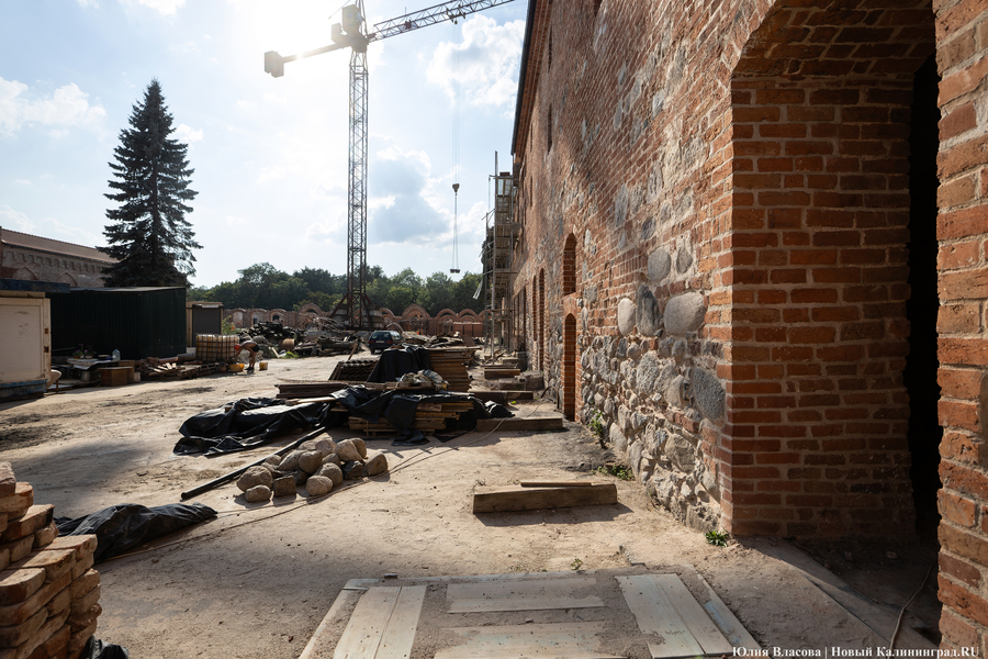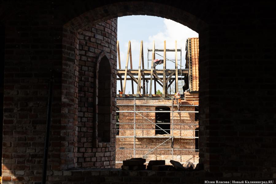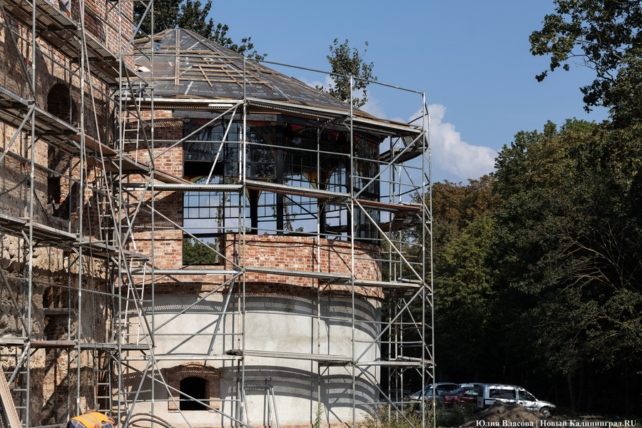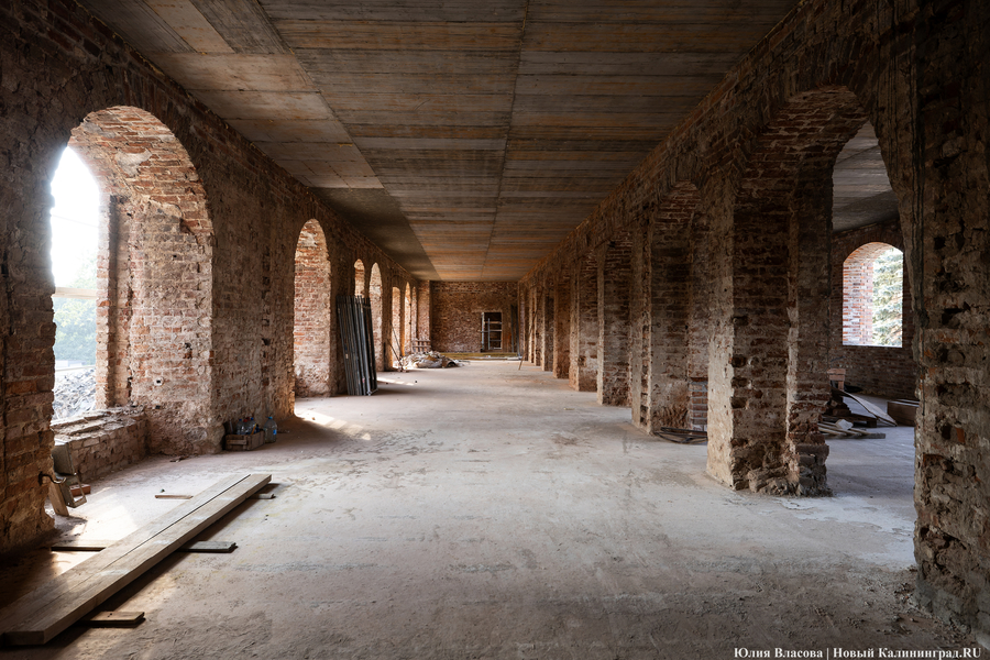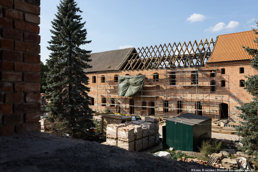 «Внутренние помещения северного флигеля у нас где-то на 60% готовы, — рассказал Михаил. — Там выполнена реставрация стен. Где обвалы были, мы всё восстановили. Там всё уже красиво, всё хорошо. Кстати, во время восстановления крыши этого флигеля мы использовали и старые, и современные материалы. По-моему, очень хорошо получилось. На втором этаже тут откроется музей замка Нойхаузен. Там же мы планируем открыть большой мультифункциональный конференц-зал на 300 посадочных мест. Мы там и концерты собираемся проводить, и конференции, и какие-то выставки, а также прочие мероприятия».