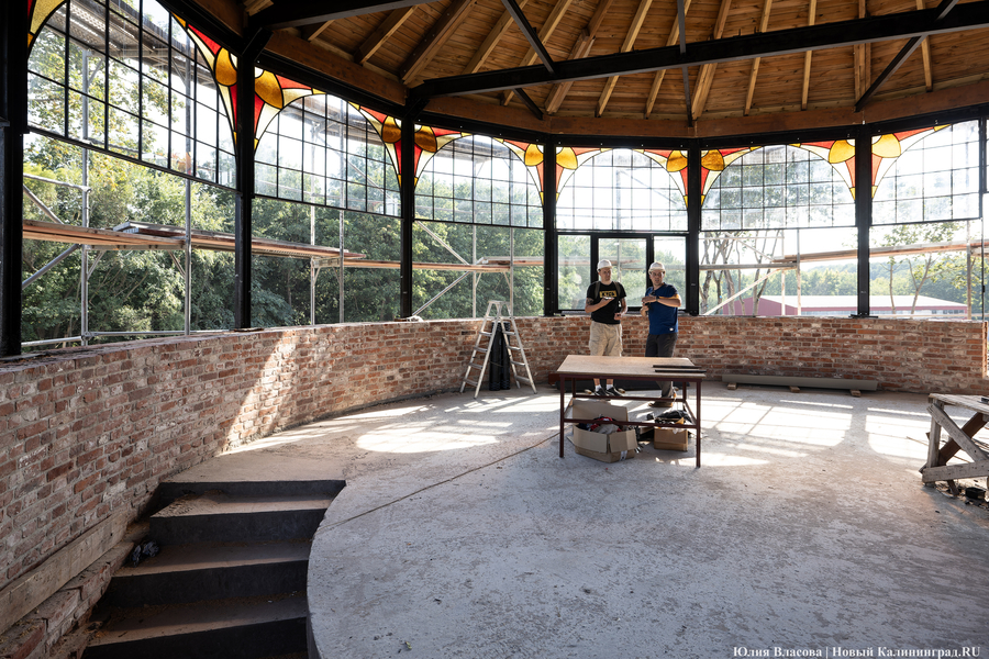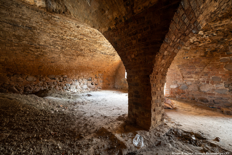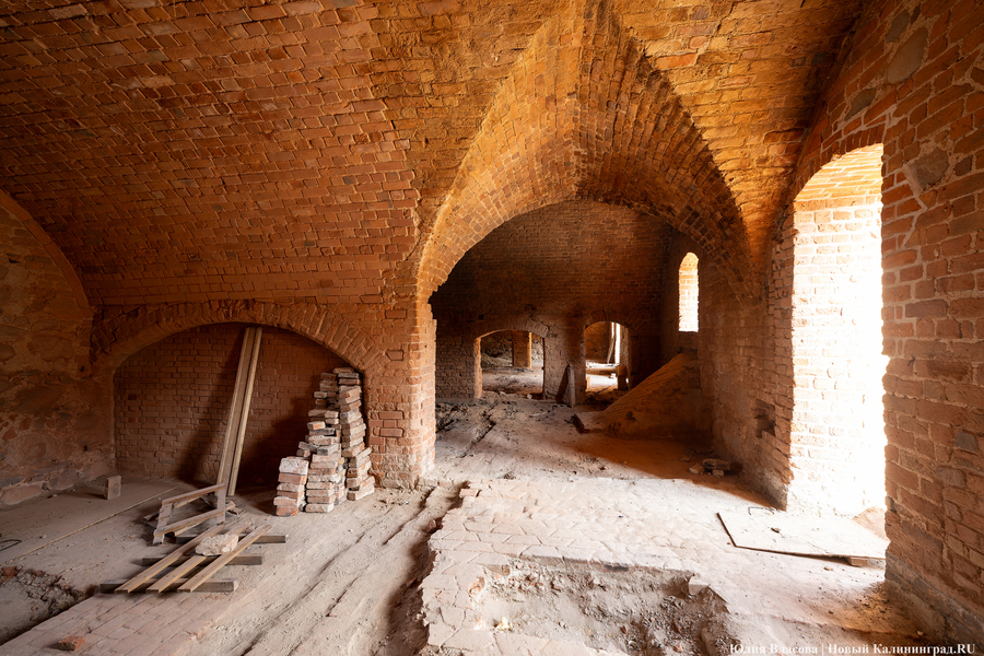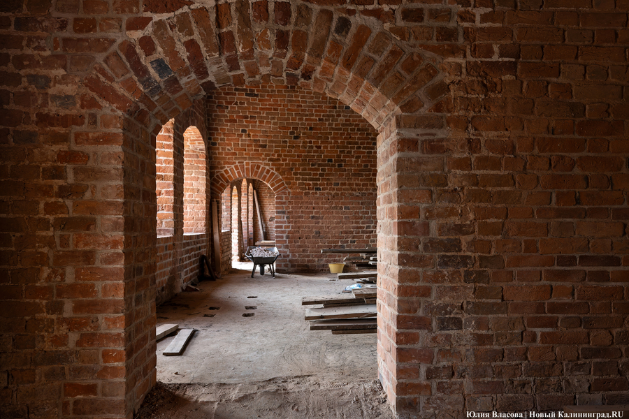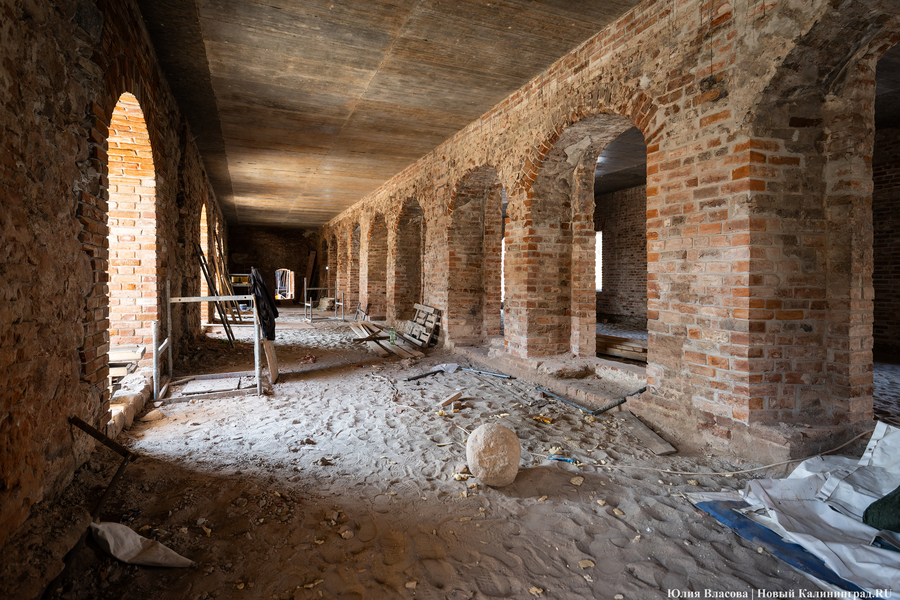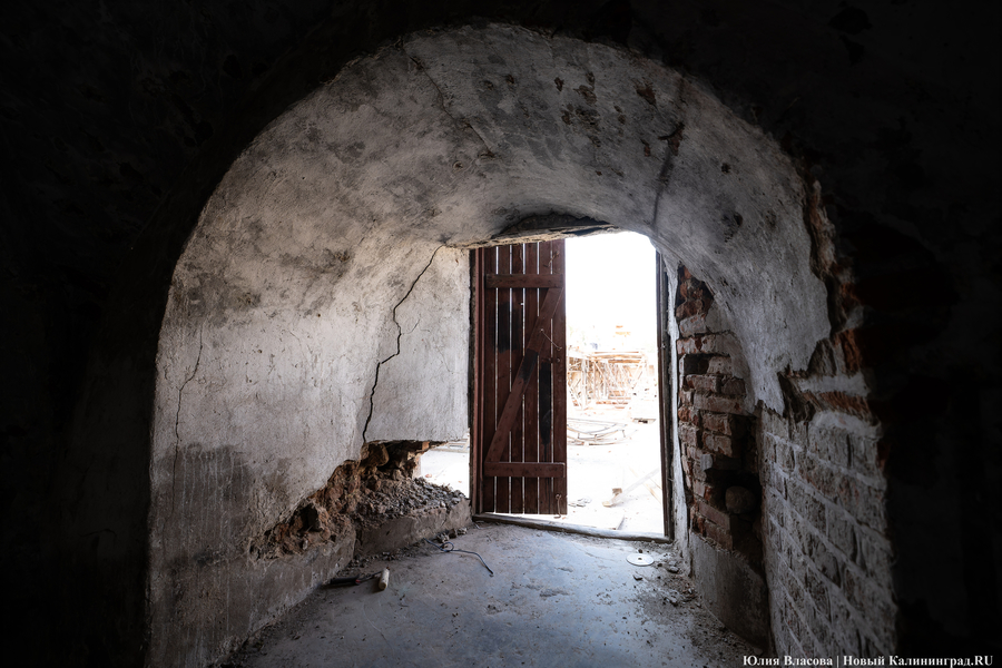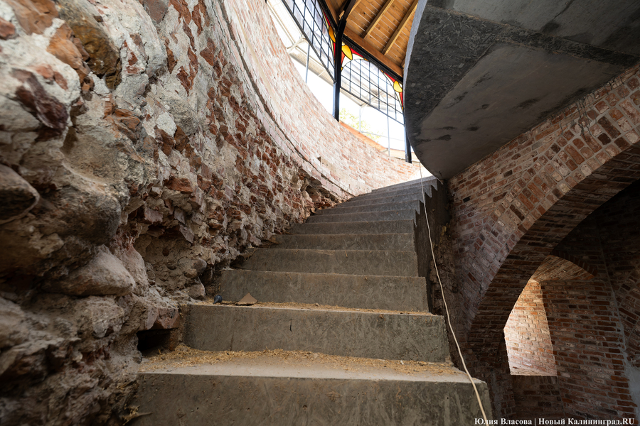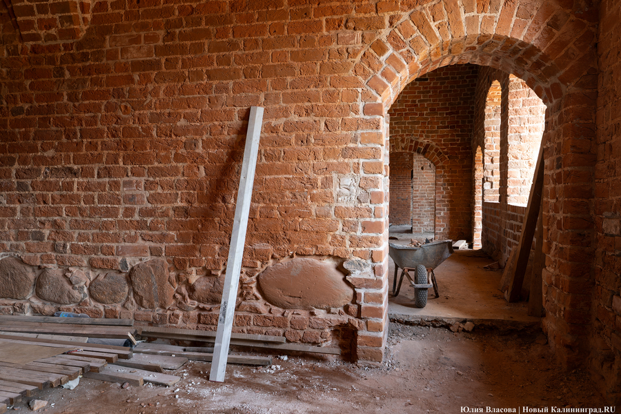 По деталям восстановления более подробно рассказал директор по эксплуатации замка Нойхаузен Игорь Маревичев. Начав экскурсию с круглой башни, в которой до войны находилась оранжерея, он рассказал, что строителей поразил кирпичный купол над подвалом. Так как конструкция действительно выглядит эффектно, одним из решений подрядчика может быть накрытие его стеклянным полом.