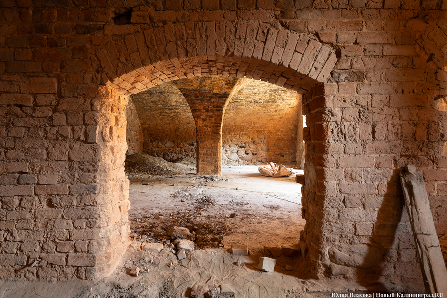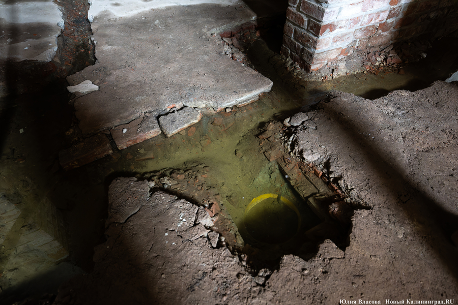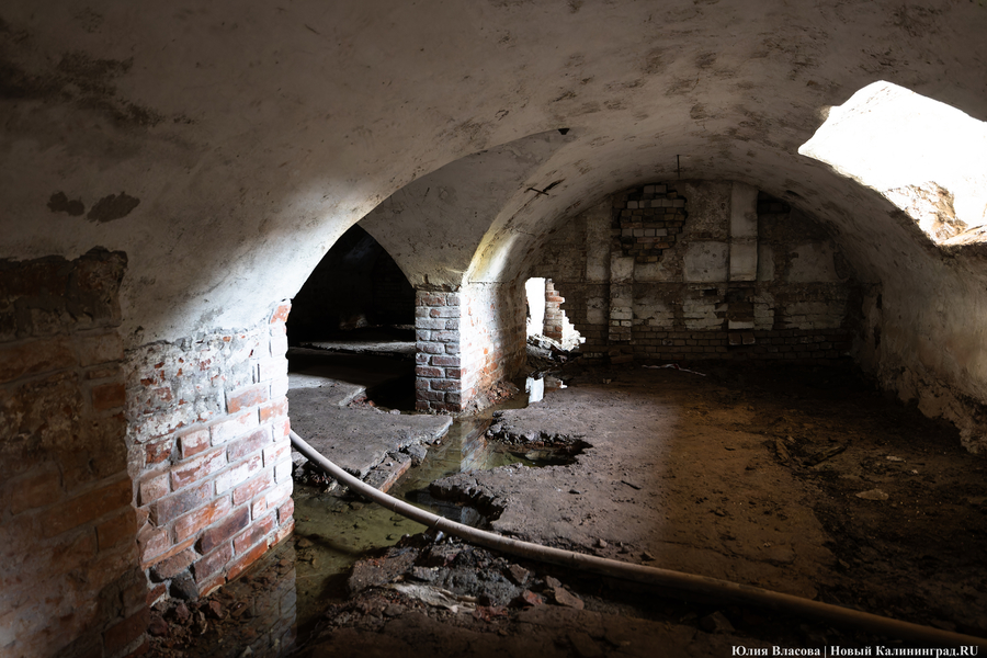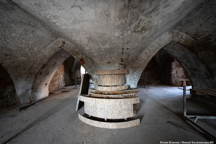 «Он тут явно не помещался и уходил на второй этаж, — предполагает Маревичев. — А потом немцы его убрали и вот это всё заделали бетоном. Почему-то они не стали закладывать свод кирпичом. Вообще же в помещениях первого этажа вы как в сказку попадаете: кирпич местами выложен так несуразно, как в какой-то „Алисе в стране чудес“. Видно, что тут неоднократно все перестраивалось разными мастерами. А в советское время и в 1990-х тут была комната для умывания для рабочих и бытовые помещения».