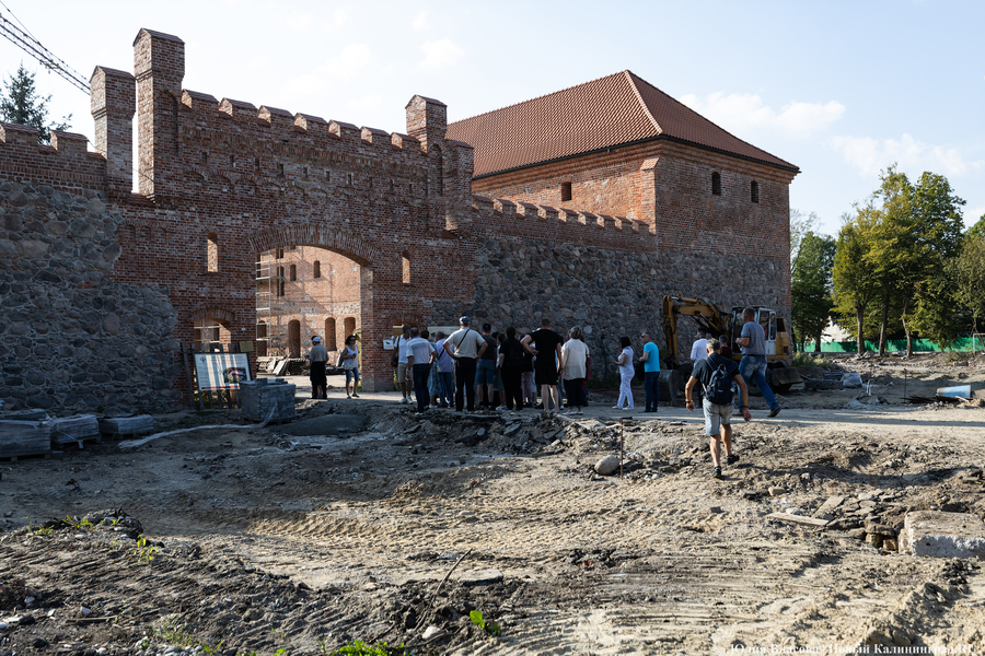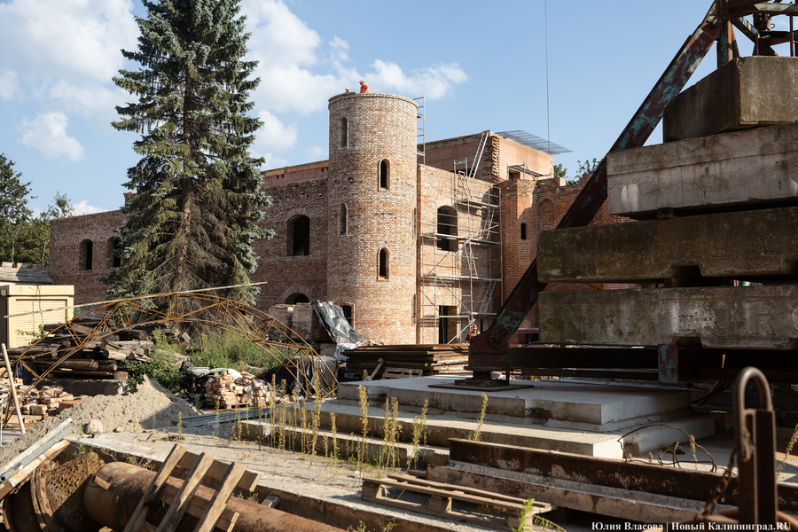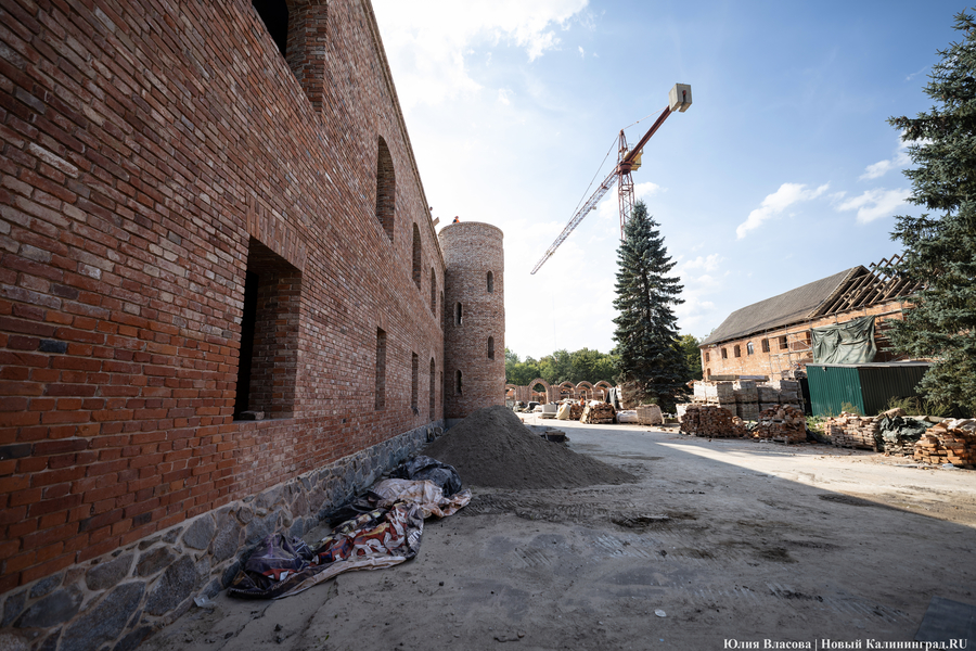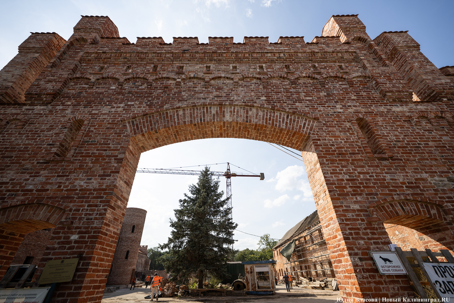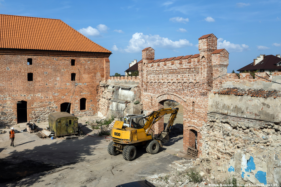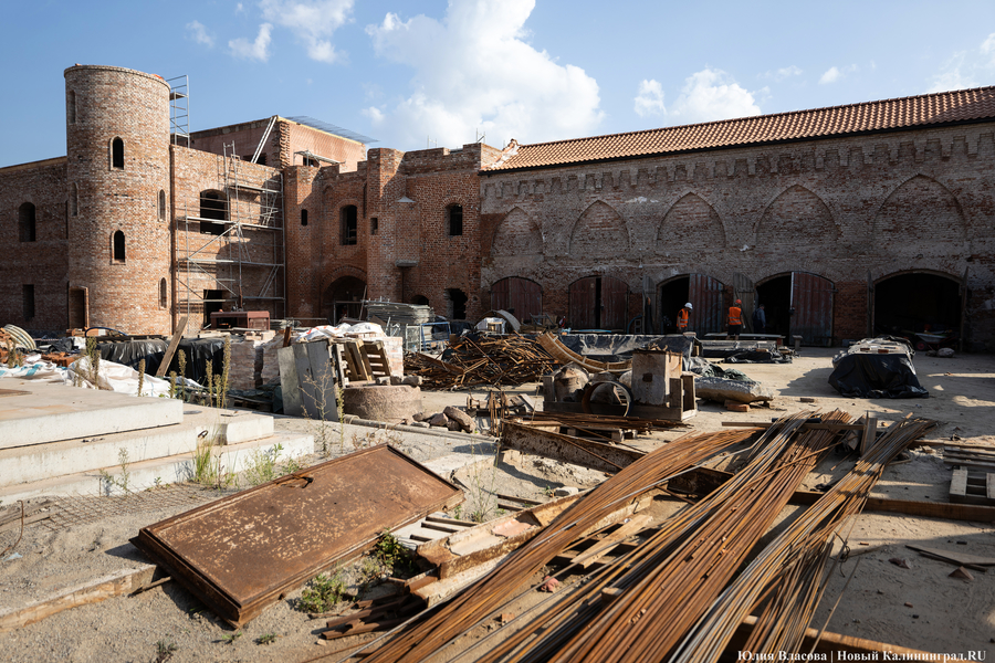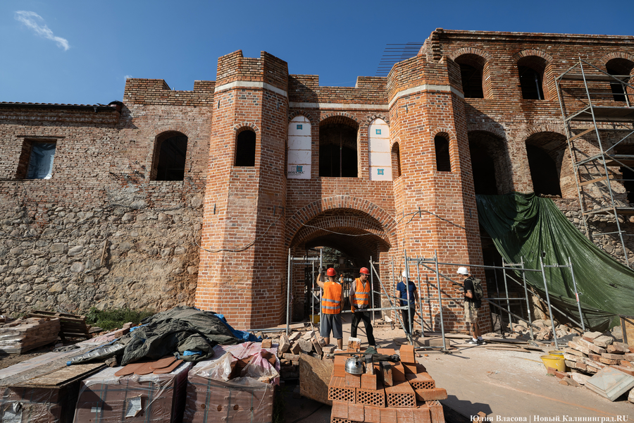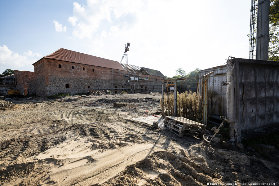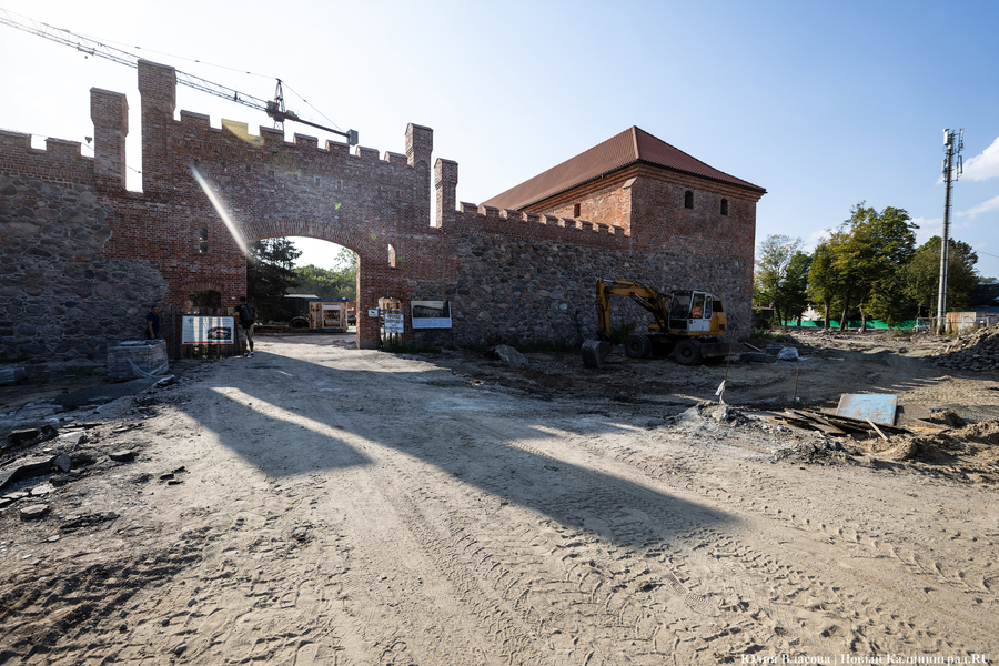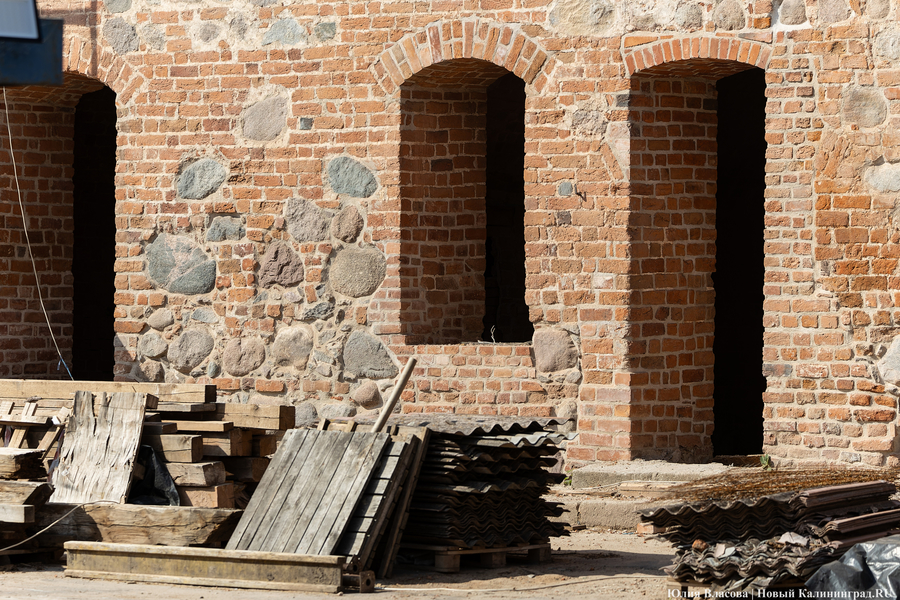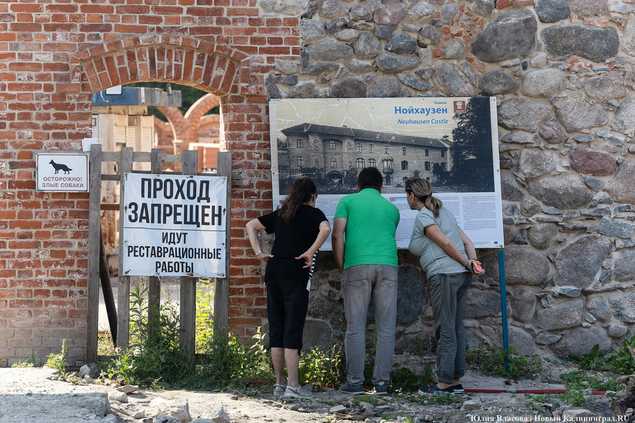 Впервые обзорную экскурсию по стройке, в которую превратился замок Нойхаузен, «Новому Калининграду» провели ровно год назад. На тот момент реконструкция шла всего пять месяцев, и планы на неё местами были лишь обозначены. Замок всё ещё «дышал» промзоной (ранее на его территории базировалась передвижная механизированная колонна № 3), и его окружение было соответствующим. Сегодня заслонявший старинную крепость от посторонних бетонный забор практически полностью демонтирован (остаётся всего пара пролётов), пристройки советского времени снесены, а полуразрушенным восточным воротам вернули исторический облик. Директор компании «Мироздание» (она является подрядчиком на этом объекте) Михаил Тимошенко рассказал, что у северного и самого древнего флигеля кровля с шиферной на черепичную практически полностью заменена, и вскоре эта часть замка станет ключевой точкой притяжения.