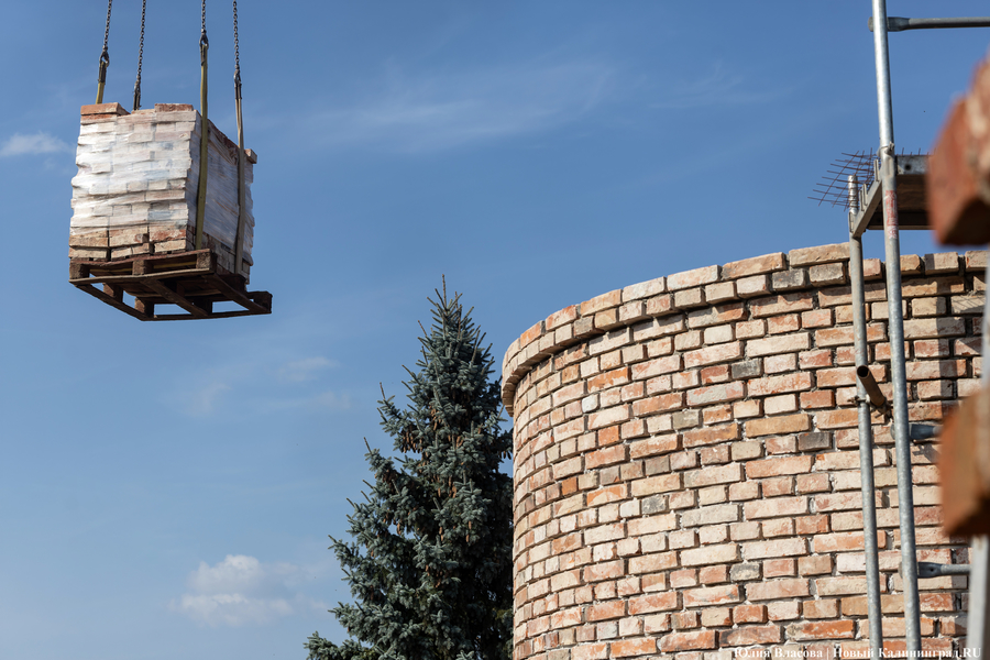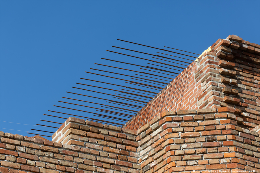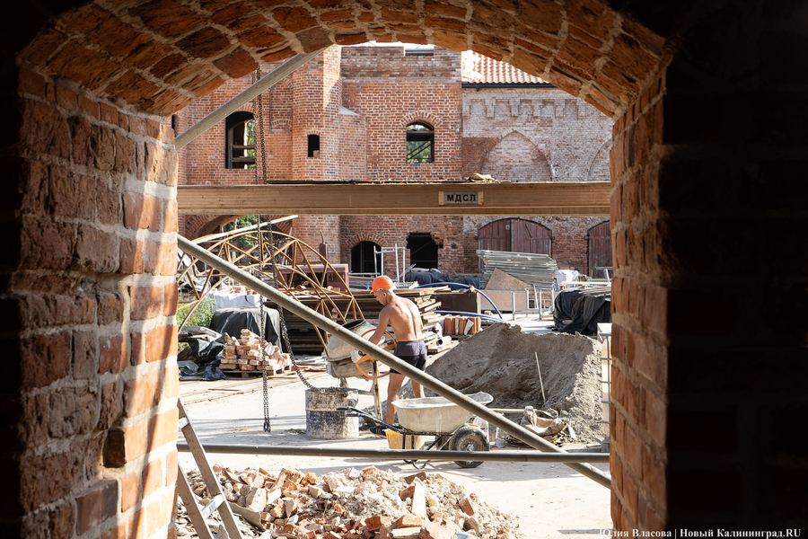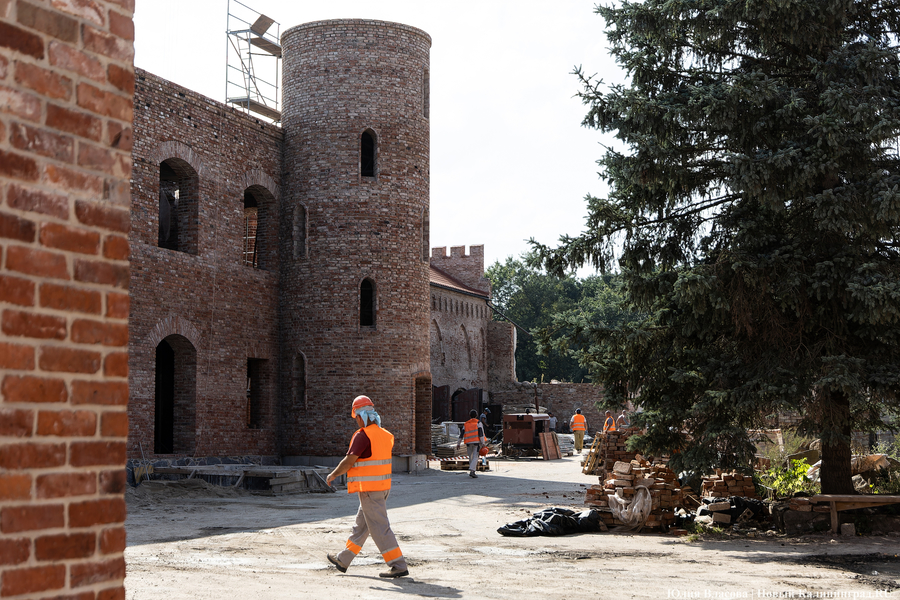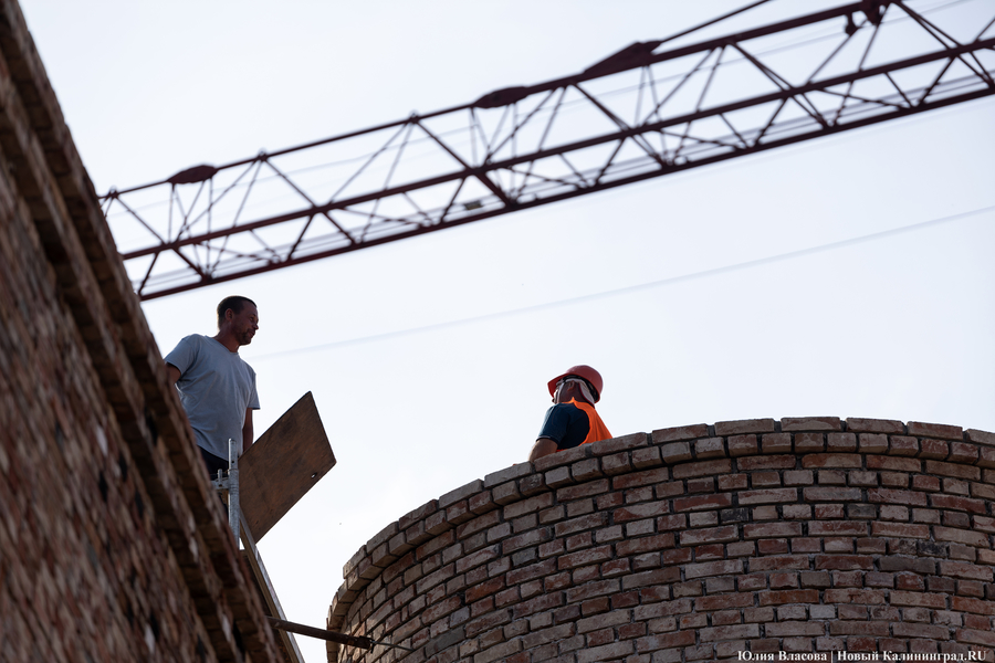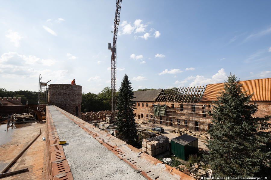 «Дело в том, что была жарища, поэтому строителям пришлось в такую рань начинать работу. Как только бетон отстоится, ребята начнут монтировать двухскатную крышу. На круглой башне южного флигеля, которая у нас во внутреннем дворе, осталось сделать два ряда кирпича — в плане возведения стен она также почти готова. Сейчас начнётся производство такой большой конусообразной кровли из меди с громадным флагштоком и большим флагом. Есть историческая фотография, на которую мы ориентируемся», — пояснил подрядчик.