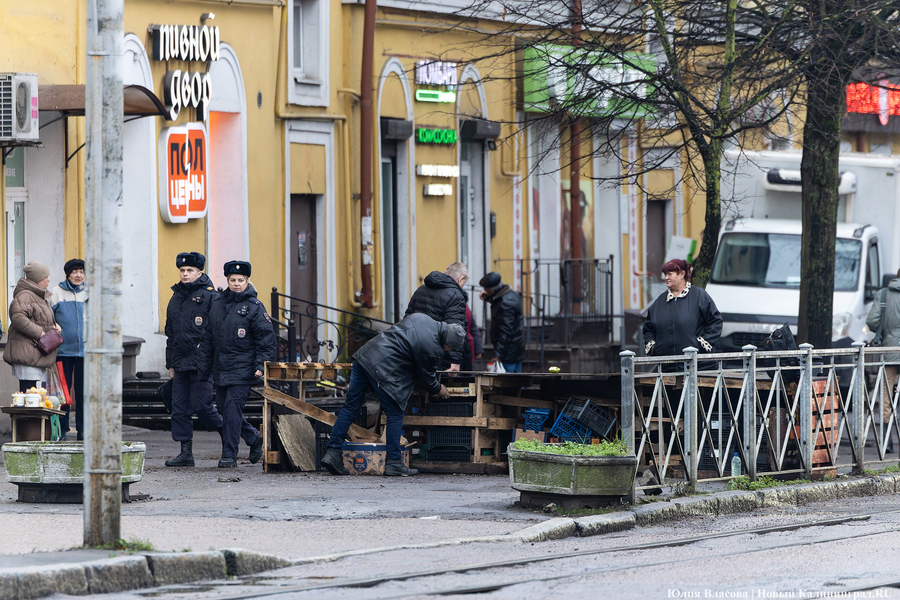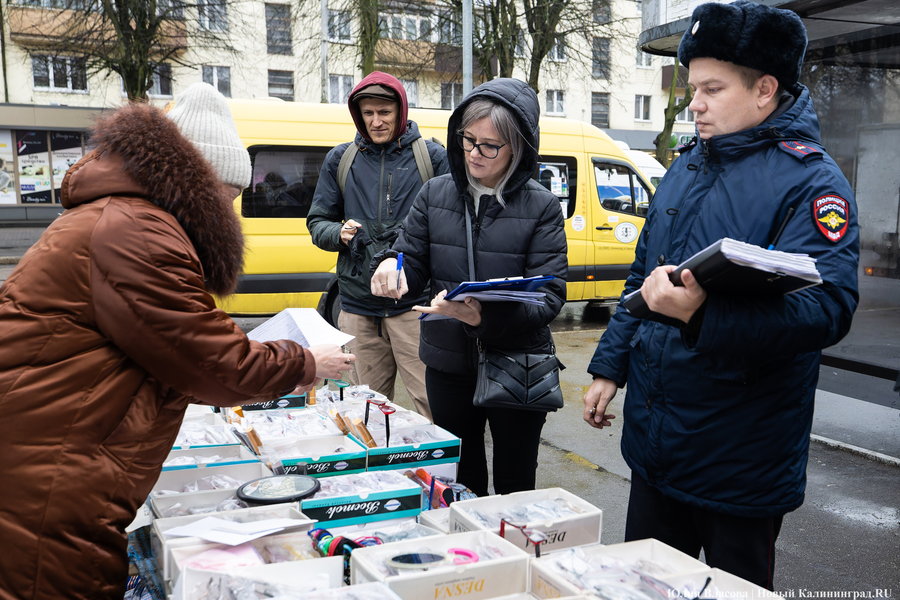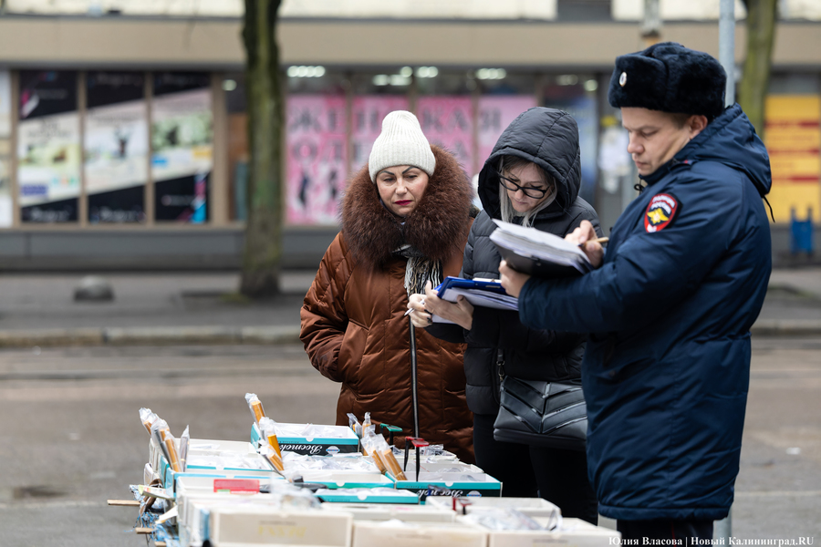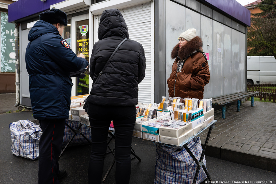 «С полицией у нас, наверное, всего три рейда было за этот год, — рассказала „Новому Калининграду“ главный специалист отдела контроля в сфере благоустройства комитета муниципального контроля Анна Биндасова. — С ними очень сложно договориться и состыковаться. Также сложно добиться того, чтобы при их появлении никто не убежал и остался торговать».