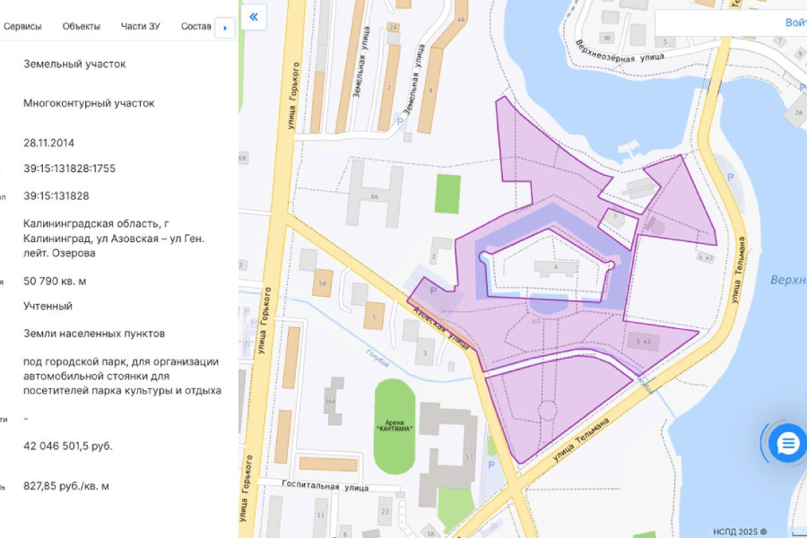 Вполне логично возникает вопрос — что относится к парковой зоне, а что — к зоне мемориала. Выяснилось, что как таковой зоны мемориала не существует. По данным Росреестра от февраля 2025 года, территория парка целиком находится в аренде у компании «Стройинвестрегион-Калининград». Земельный участок с кадастровым номером 39:15:131828:1755, расположенный в границах ул Азовской – Озерова, площадью 50,790 тыс. кв. м, относится к землям населенных пунктов. Вид разрешенного использования: под городской парк, для организации автомобильной стоянки для посетителей парка культуры и отдыха. Кадастровая стоимость — 42,046 млн руб. Форма собственности и правообладатель в данных ФГИС ЕГРН не указаны, однако в выписке отмечается, что участок по договору на передачу в аренду городских земель № 011392 от 30 мая 2012 года в аренде у компании «Стройинвестрегион — Калининград». Срок аренды — по 11 мая 2017 года, ИНН 3906137680 принадлежит ЗАО «Стройинвестрегион — Калининград» , которое в настоящее время ликвидировано. Правопреемником ЗАО является ООО «Стройинвестрегион — Калининград» с тем же учредителем Ириной Сергеевой и директором Илоной Кулумбеговой. ИНН у этой компании другой — 3906346067. Иных данных о переходе права на земельный участок в ЕГРН не значится.