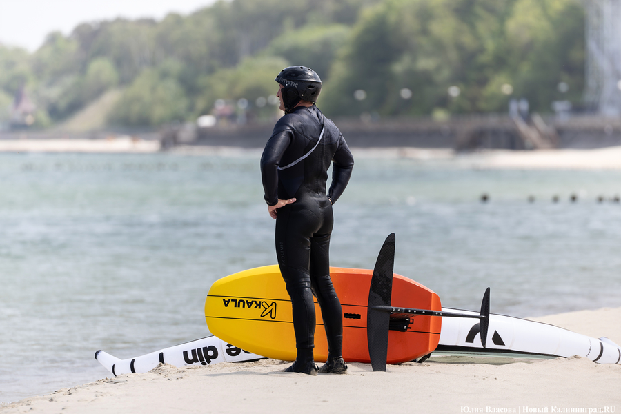 Белый песок и просторный пляж — первое, что цепляет взгляд в следующей точке маршрута — Пионерском. У волейбольных площадок пока пустынно, но любители водных видов спорта с утра уже в строю.