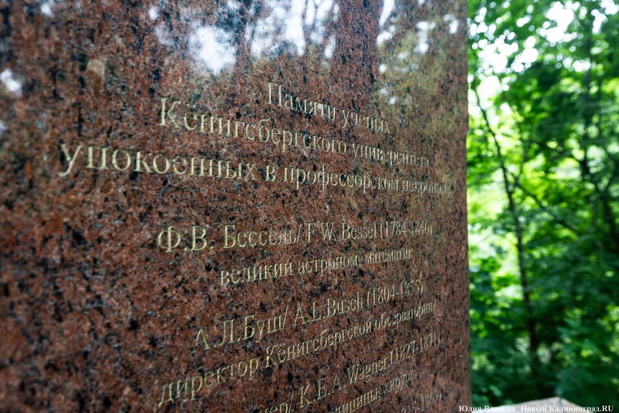 В докладной записке директора Калининградского областного краеведческого музея Ковтуна начальнику областного управления культуры М.С. Шумихину сообщается: «Холм, на котором расположена обсерватория, был изрыт глубокими траншеями и дотами. Главная астрономическая башня являлась наблюдательным пунктом, фашисты на ней установили огневые точки. Вся прилегающая к обсерватории территория была превращена в пункты обороны, в том числе и прилегающее к северо-западу к обсерватории кладбище — некрополь учёных Кёнигсбергского университета. Были разрушены все здания обсерватории. Главная астрономическая башня хотя и уцелела, но имеет большие повреждения. Некрополь зарос кустарником и травой и с трудом был отыскан. В результате поисков найдена могила астронома Бесселя — гранитный куб с надписью Friedrich Wilhelm Bessel был обнаружен в траншее, засыпан землёй. Сейчас он поставлен на место, но бронзовый бюст Бесселя не найден».