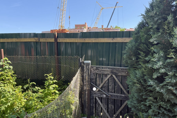 В конце июня строительный забор придвинули уже совсем вплотную к участку жильцов, не оставив привычного проезда к дому (возможный подъезд с второй стороны жителями не использовался — там размещены их хозпостройки, огород и т.п.).