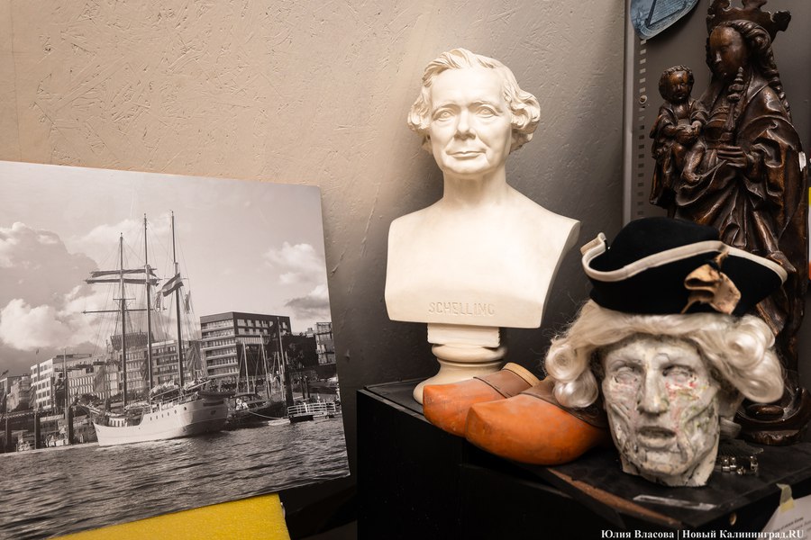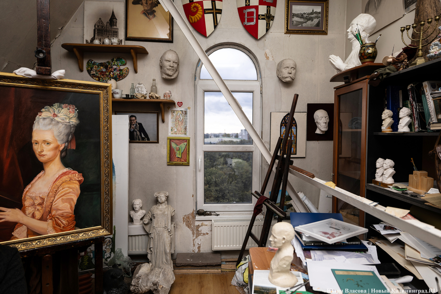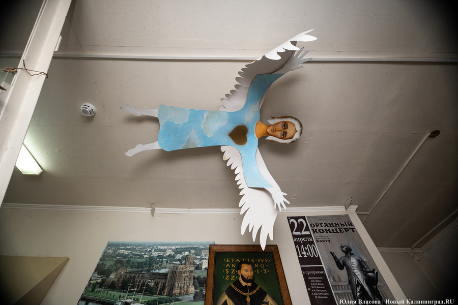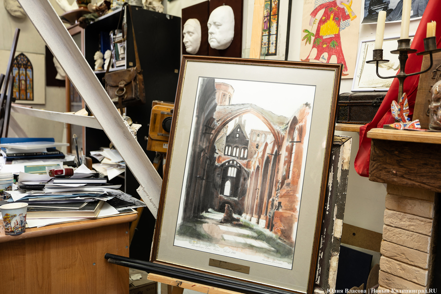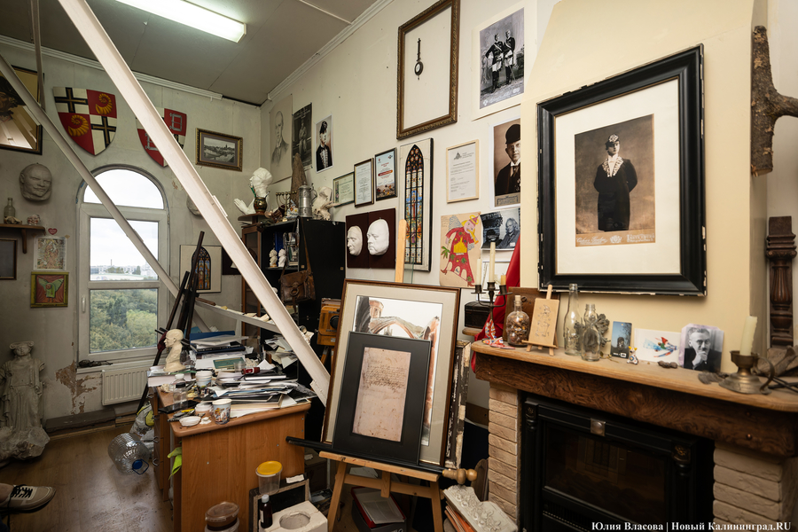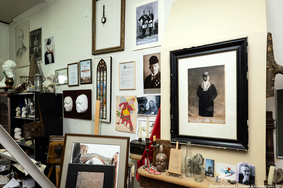 Художник Кафедрального собора Владимир Чиликин уже шесть лет водит экскурсии в образе Иммануила Канта. Его мастерская — на верхотуре, под тем самым кантовским звёздным небом. Когда поднимаешься по старинной винтовой лестнице, прикасаешься руками к стенам. Думаешь о том, что, возможно, их касались руки великих магистров Кенигсберга. На память приходит цитата о сумрачном германском гении. Те же ощущения в мастерской: посмертные маски Канта и королевы Луизы, шлем Альбрехта, в рамке — билет на последний органный концерт в Соборе «Страсти по Матфею» (исполнял органист Герберт Вильгельми). На стене — его портрет. Дух канувшего в Лету города ощущается здесь материально.