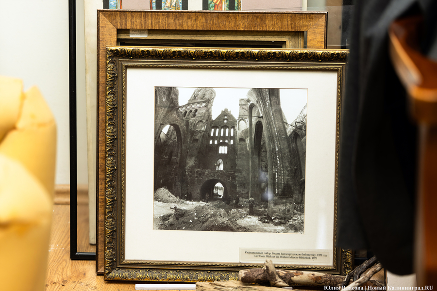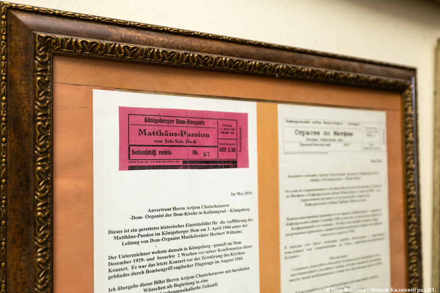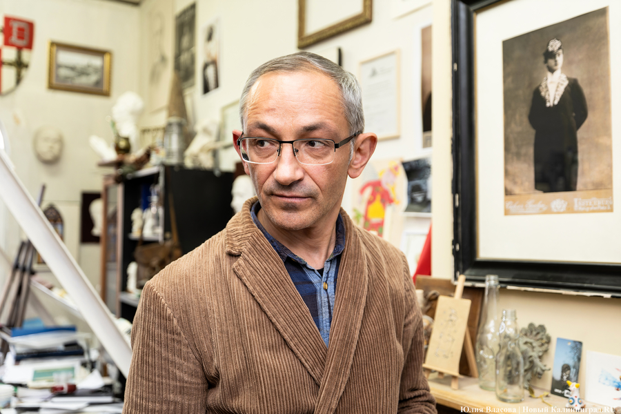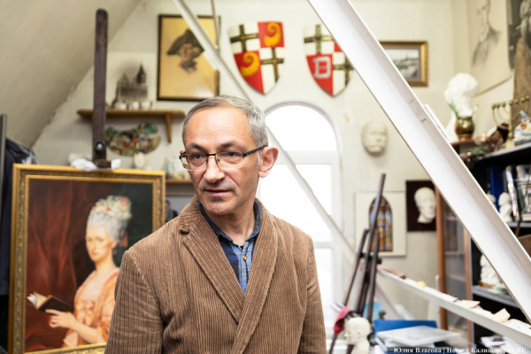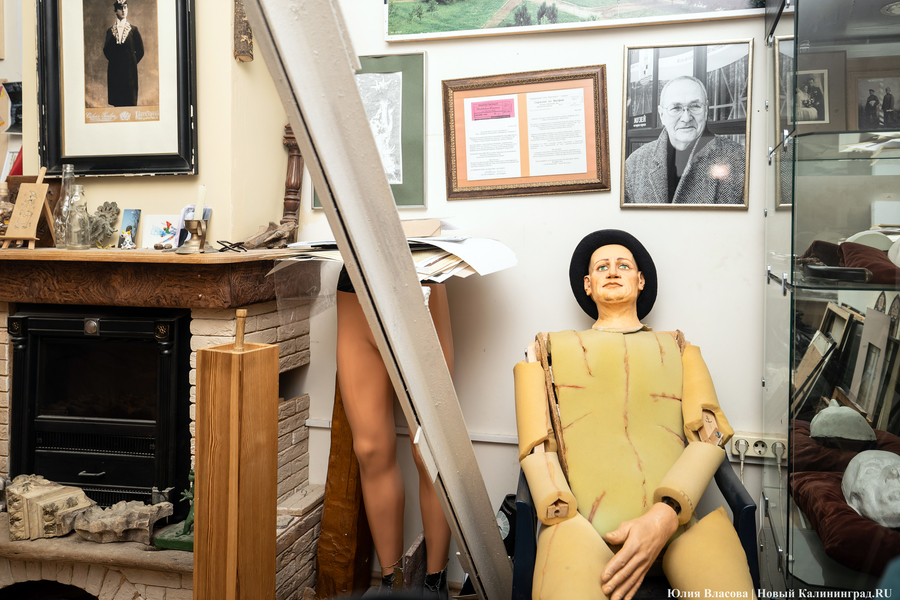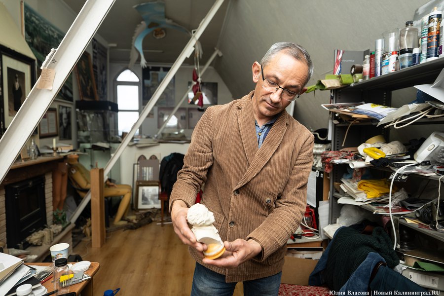 Художник Кафедрального собора Владимир Чиликин уже шесть лет водит экскурсии в образе Иммануила Канта. Его мастерская — на верхотуре, под тем самым кантовским звёздным небом. Когда поднимаешься по старинной винтовой лестнице, прикасаешься руками к стенам. Думаешь о том, что, возможно, их касались руки великих магистров Кенигсберга. На память приходит цитата о сумрачном германском гении. Те же ощущения в мастерской: посмертные маски Канта и королевы Луизы, шлем Альбрехта, в рамке — билет на последний органный концерт в Соборе «Страсти по Матфею» (исполнял органист Герберт Вильгельми). На стене — его портрет. Дух канувшего в Лету города ощущается здесь материально.
