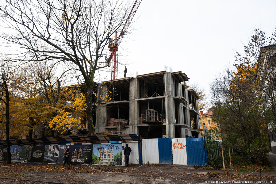 В паспорте объекта на строительном заборе значится, что на земельном участке площадью 835 кв. м.здесь возводится пятиэтажный многоквартирный дом «со встроенным подземным паркингом и помещениями общественного назначения» застройщиком официально значится Наталья Мазилкина — родная сестра председателя Законодательного собрания Калининградской области Андрея Кропоткина. Закончить строительство дома № 8 планируется в декабре 2026 года. Также паспорт сообщает, что строительство осуществляется силами компании «Кёниг-Хольц». На размещённом на заборе плакате — изображение будущего здания «в стиле виллы Шмидта», фотографии которого ещё в октябре 2024 года были предоставлены источником «Нового Калининграда».