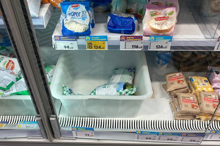 «Голубые ценники» в «Пятёрочке» по-прежнему сложно найти. Под них, если не вчитываться, «маскируются» отметки «Выбираю калининградское», которые бывают и синие, и голубые, и сине-красные. Во время нашего визита в магазин ценник региональной программы доступных цен мы нашли только на сметану «Нежинская», правда, самой сметаны на полке не оказалось. Рядом с тушкой цыплёнка, напротив, был пустой ценник. Из доступных в рамках программы продуктов удалось найти минтай. Килограмм можно приобрести за 259,49 руб.