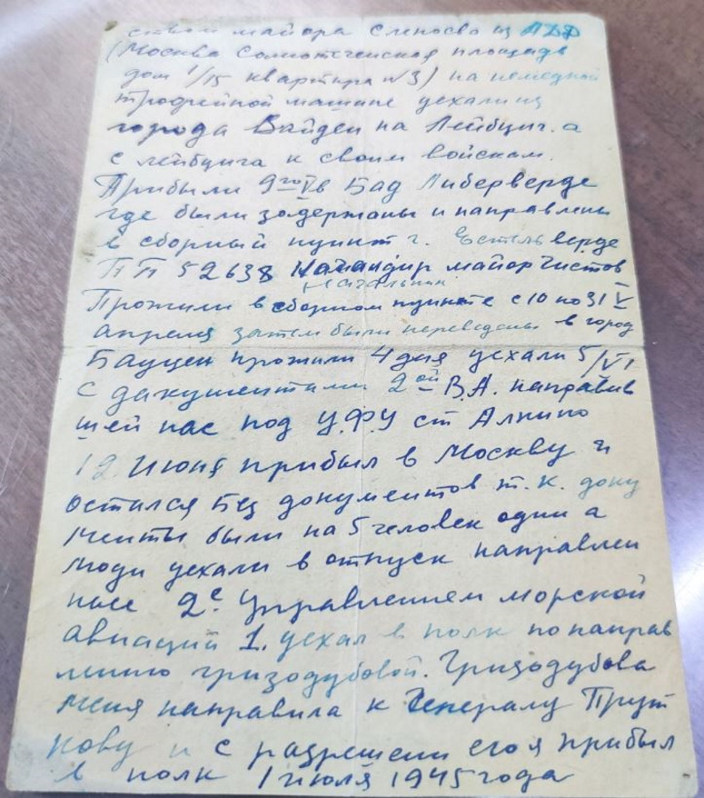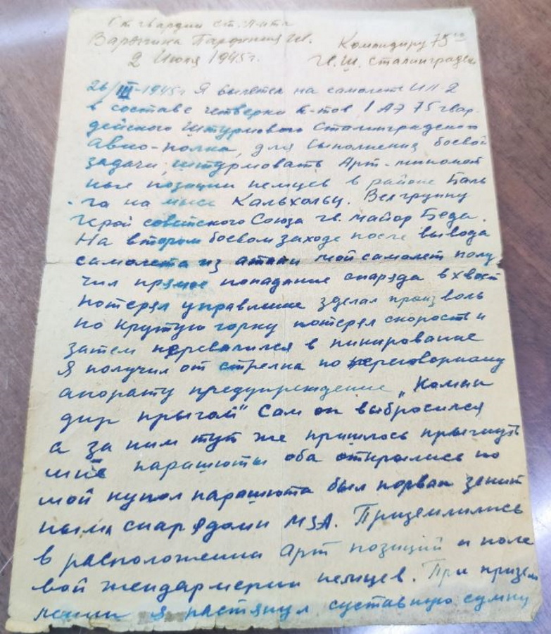 Получилось так, что рассказ пензенского краеведа стал недостающим элементом истории летчика. В общем, пазл сложился. Не хватало лишь подробностей о судьбе стрелка-радиста Мишина. Однако и эти данные нашлись в семейном архиве Варыгиных. Родственники летчика дали Геннадию Полубедову ознакомиться с копией собственноручной записки (на четырех листах) гвардии старшего лейтенанта Варыгина от 2 июля 1945 года на имя командира 75-го гв. ШАП (выходит, к этому времени он уже вернулся в свой полк).