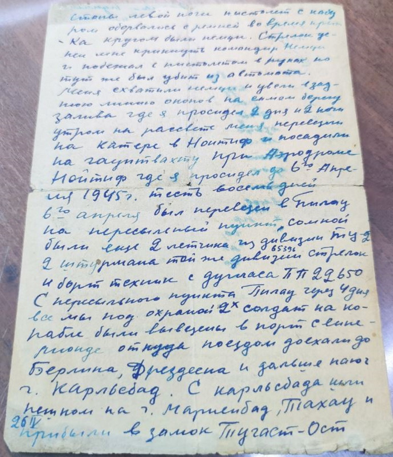 «Кругом были немцы, — продолжает лётчик. — Стрелок успел мне крикнуть: „Командир, немцы“ — и побежал с пистолетом в руках, но тут же был убит из автомата. Меня схватили немцы и увели в заднюю линию окопов на самом берегу залива, где я просидел 2 дня и 2 ночи. Утром на рассвете меня перевезли на катере в Нойтиф и посадили на гауптвахту при аэродроме Нойтиф, где я просидел до 6 апреля 1945 года».