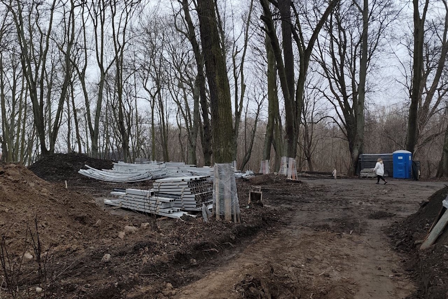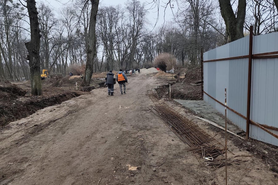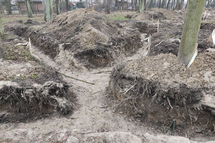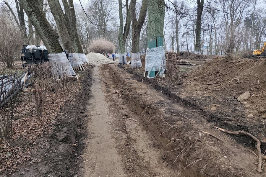 Разговор продолжился под рев строительной техники. Вообще, территория парка сейчас очень напоминает зону боевых действий — между деревьями проходят траншеи, в которые подрядчику предстоит уложить оптоволокно и кабели для наружного освещения. Заметив, что раскопки привлекли внимание журналистов, Смищук сообщил, что 14 деревьев «пришлось удалить».