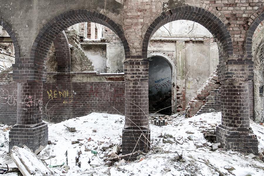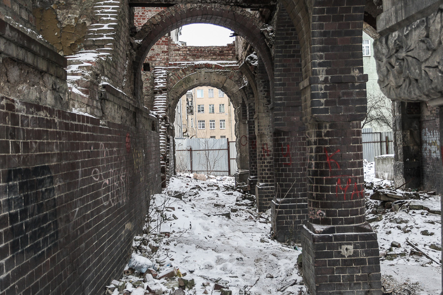 Под изящными осыпающимися арками еще сохранилась лепнина с растительным орнаментом. Фасад, когда-то скрытый строительной сеткой с красивым рисунком восстановленного здания, зияет пустыми глазницами оконных рам, за которым виднеются небо и разрушенные стены. А немецкая надпись «Kreuz Apothek», пережившая войну и чудом сохранившая в советские годы, все больше тускнеет, грозя исчезнуть в любой момент. Исчезнуть может и само здание, ведь согласно последнему заключению специалистов оно не только признано аварийным, но и зафиксирована угроза внезапного обрушения несущих конструкций.